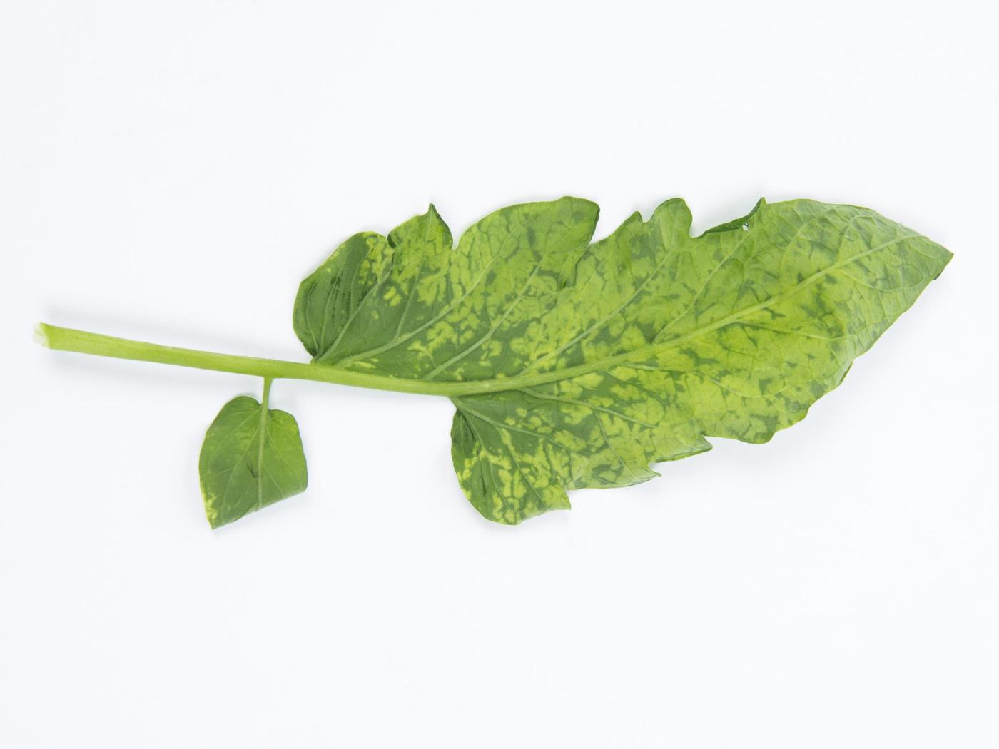 Description: Une foliole de tomate de serre (cv 'Trust') montre des taches vert pâle et quelques brûlures brunes entre les nervures. Les tests de laboratoire ont révélé la présence du virus de la mosaïque du pépino (PepMV).