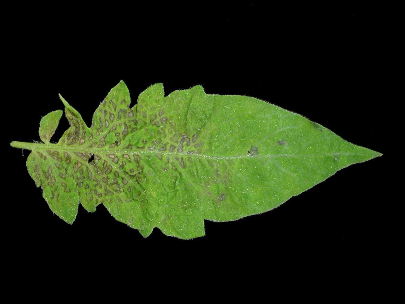 Description: Une foliole de tomate de serre (cv 'Starbuck') montre de petites taches angulaires brunes avec un centre pâle, localisées entre les nervures, dans la partie inférieure du limbe. Les symptômes étaient concentrés dans la tête des plants, sur les jeunes feuilles. Les tests de laboratoire ont révélé la présence du virus des taches en anneaux du tabac (TRSV).