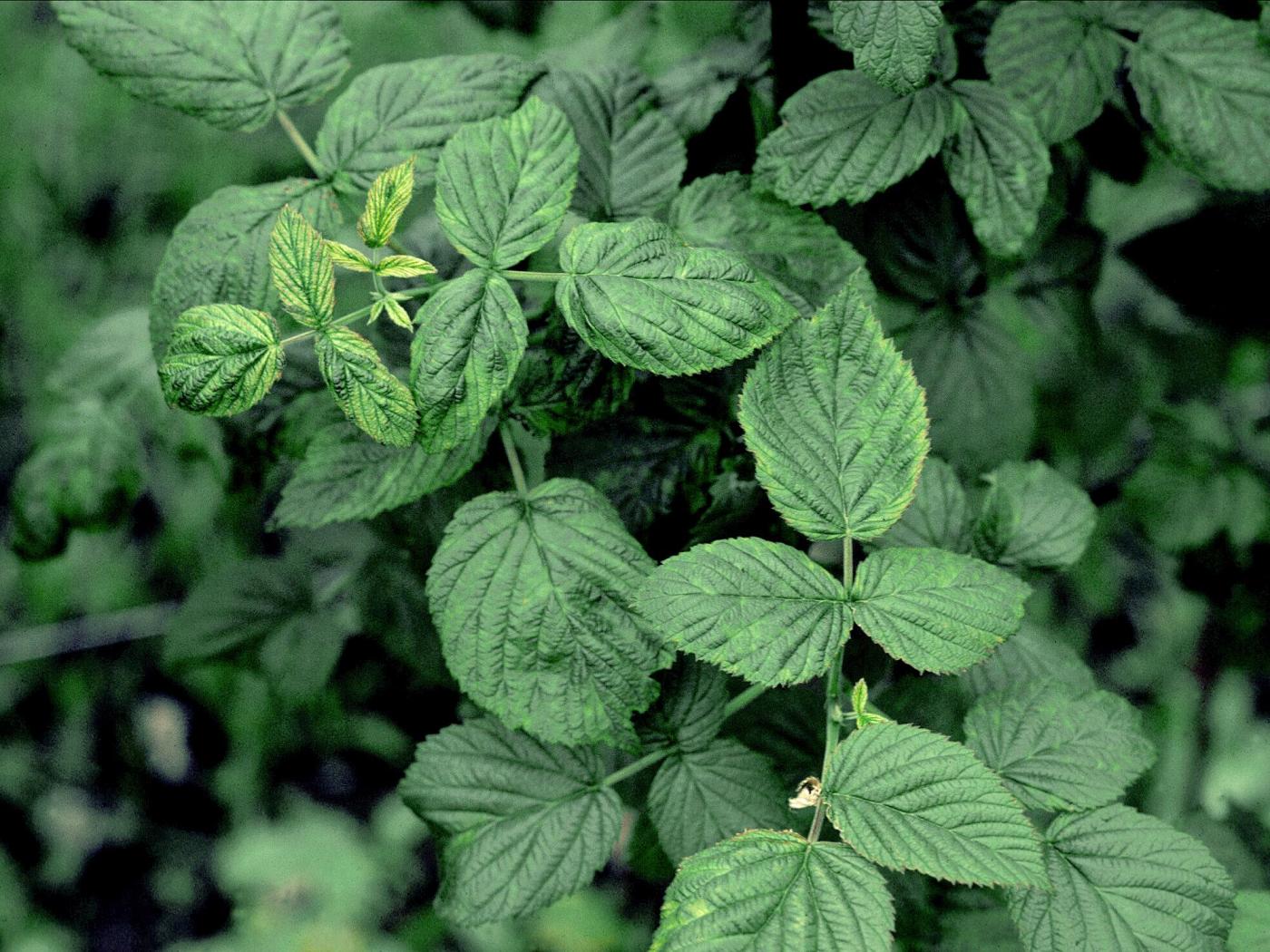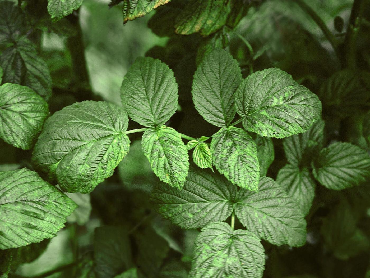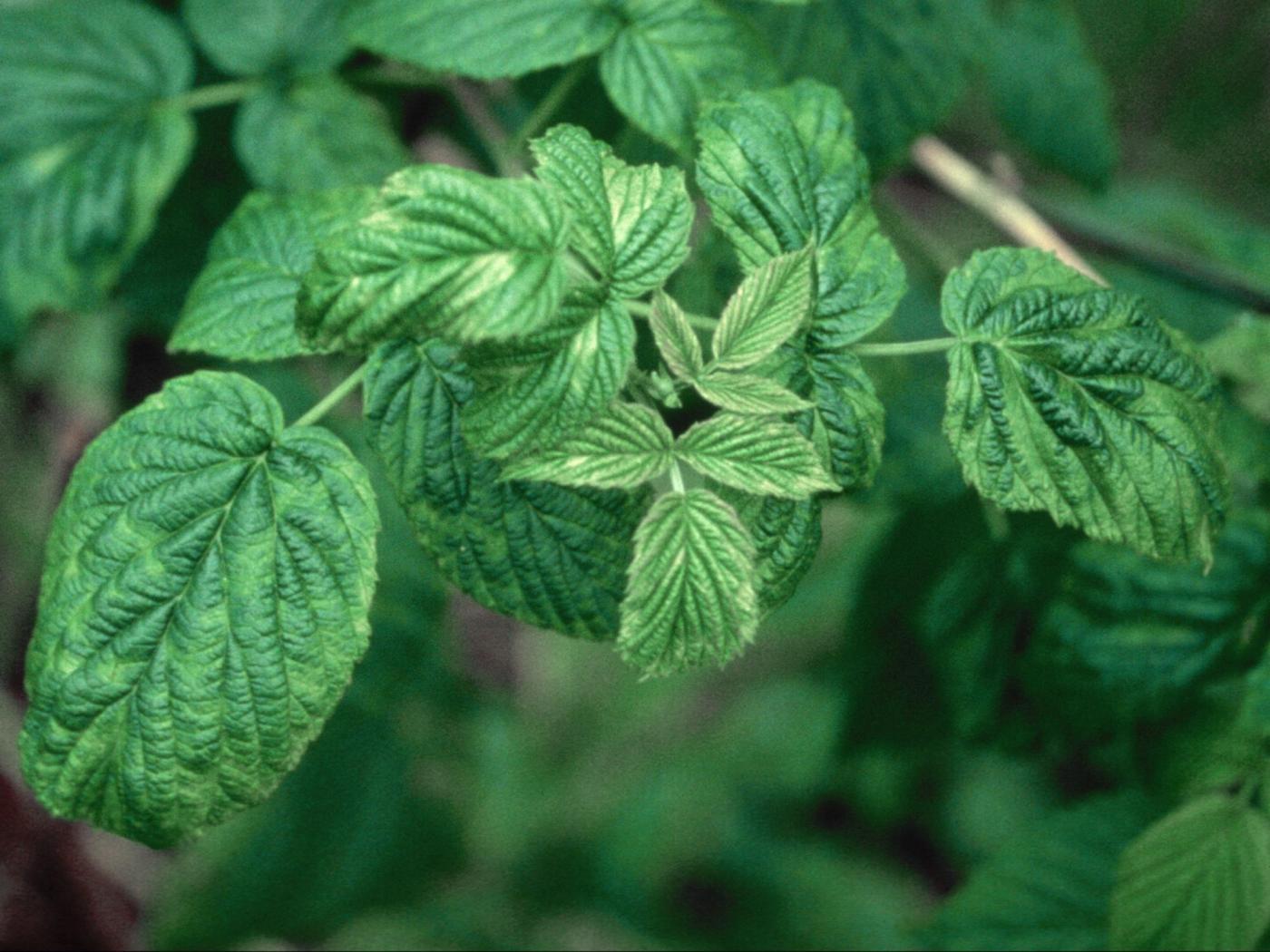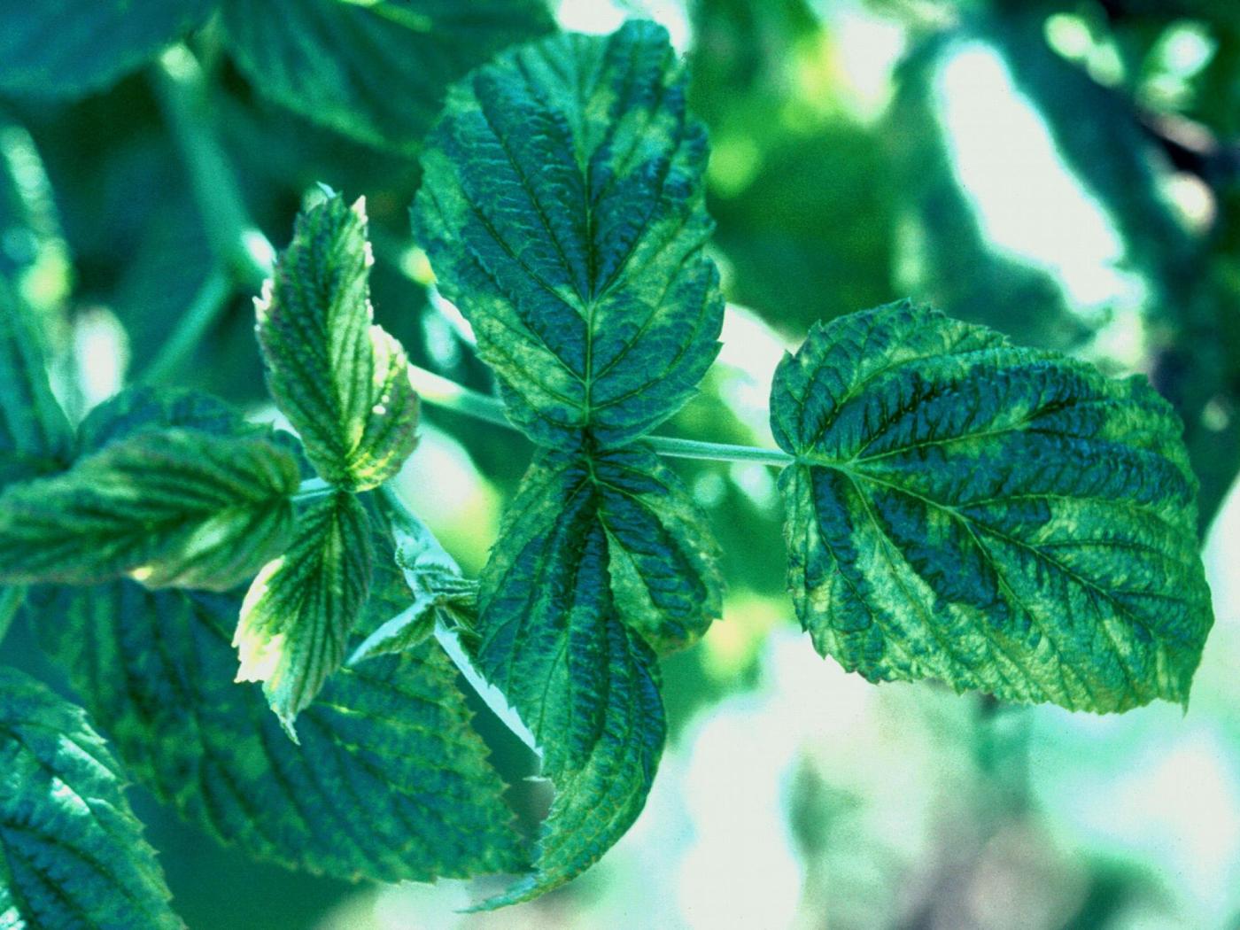 Description: Sur des feuilles de framboisier, présence d’une malformation du limbe et d’une mosaïque vert pâle à jaune. Ces symptômes sont caractéristiques d’une maladie virale dont la nature du virus n’a pu être précisée.