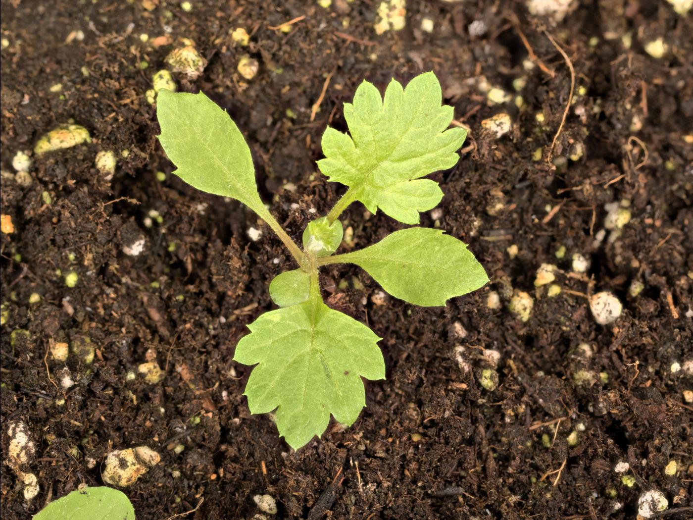 La plantule se compose de feuilles alternes qui forment une rosette. Les cotylédons sont de forme orbiculaire à ovée, sans pétiole et mesurent de 1,5 à 3 mm de longueur. Les premières feuilles sont de forme arrondie à ovale, généralement avec 2 ou 3 dents et sont terminées par une pointe. Des pousses végétatives peuvent provenir de courts rhizomes ou du collet des anciennes pousses.
