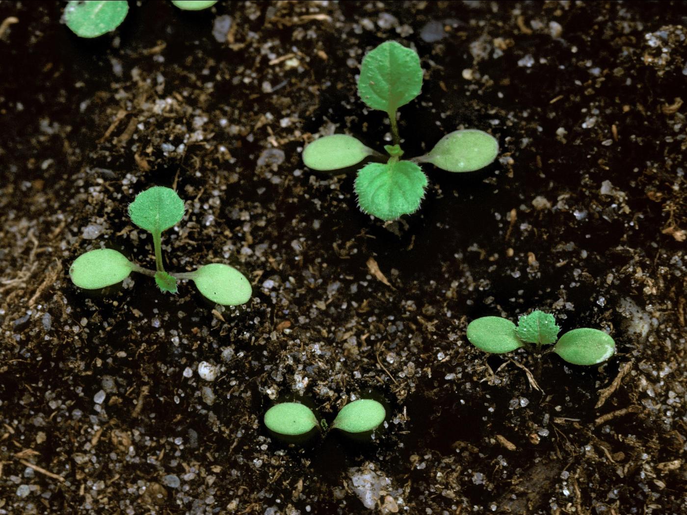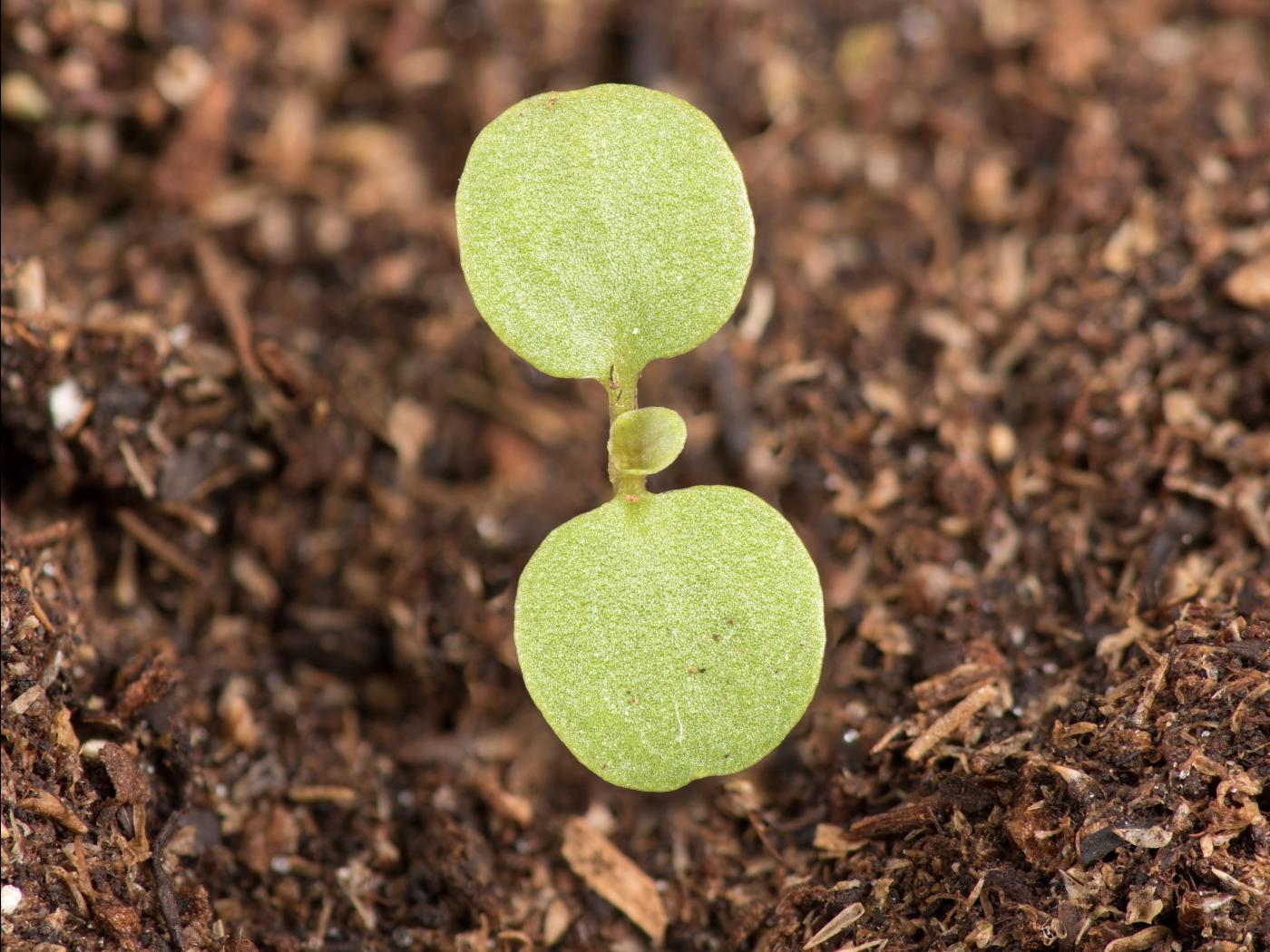 La plantule est composée de feuilles alternes qui forment une rosette. Les cotylédons mesurent de 3 à 8 mm de longueur et possèdent un pétiole distinct. Ils sont de forme oblongue à orbiculaire avec un sommet arrondi. Les premières feuilles sont entières, arrondies et longuement pétiolées. La base du limbe peut parfois être cordiforme.