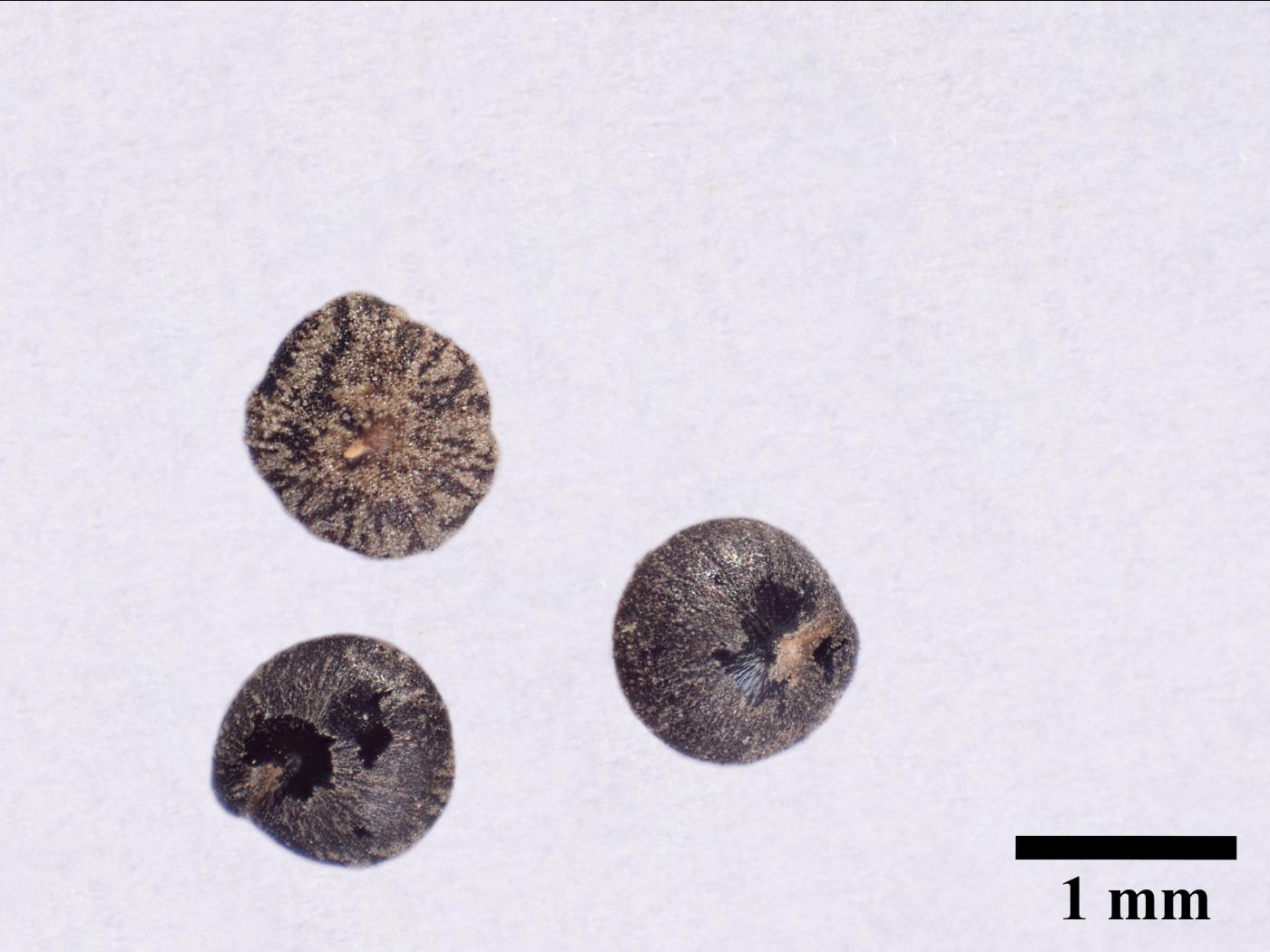 Les fruits sont des utricules de couleur brun jaunâtre recouverts d’un péricarpe très mince, délicat et à texture lisse. Il n’est pas soudé à la graine, mais il peut être difficile de l’en séparer. La graine est de forme presque circulaire semblable à une lentille : aplatie sur une face et arrondie sur l’autre. Elle est luisante, de couleur noire et mesure 1,2 mm de diamètre.