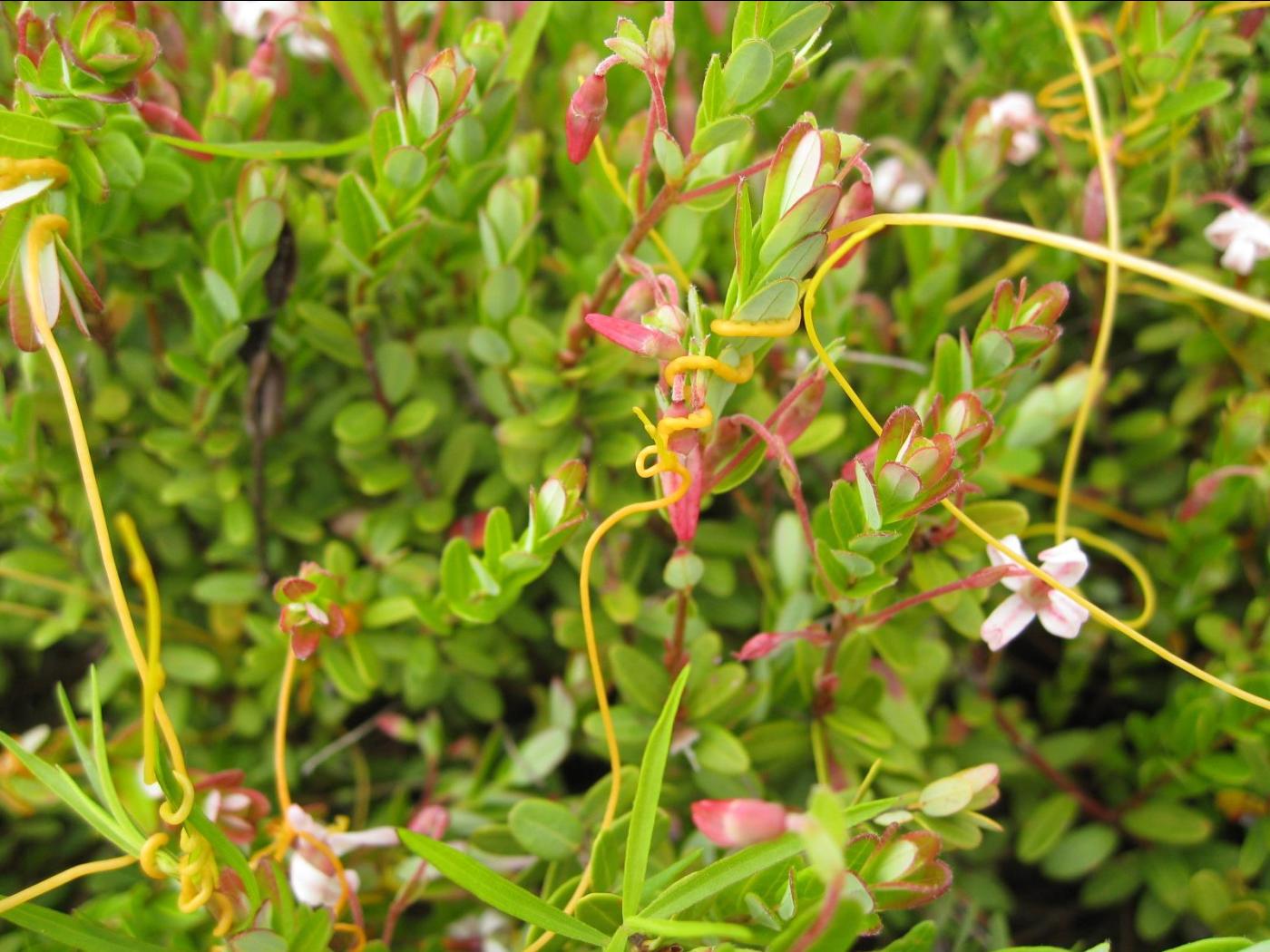 Les cuscutes se rencontrent surtout dans les zones humides ou marécageuses, mais sont présentes dans plusieurs types d’habitats et parasitent plusieurs espèces végétales. Elles affaiblissent sévèrement les plants de canneberges et peuvent réduire les rendements de façon importante même si leur développement ne semble pas extensif et menaçant.