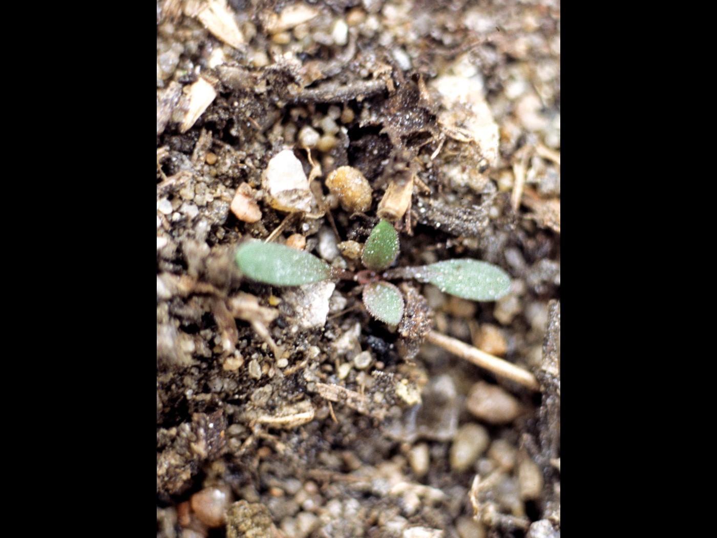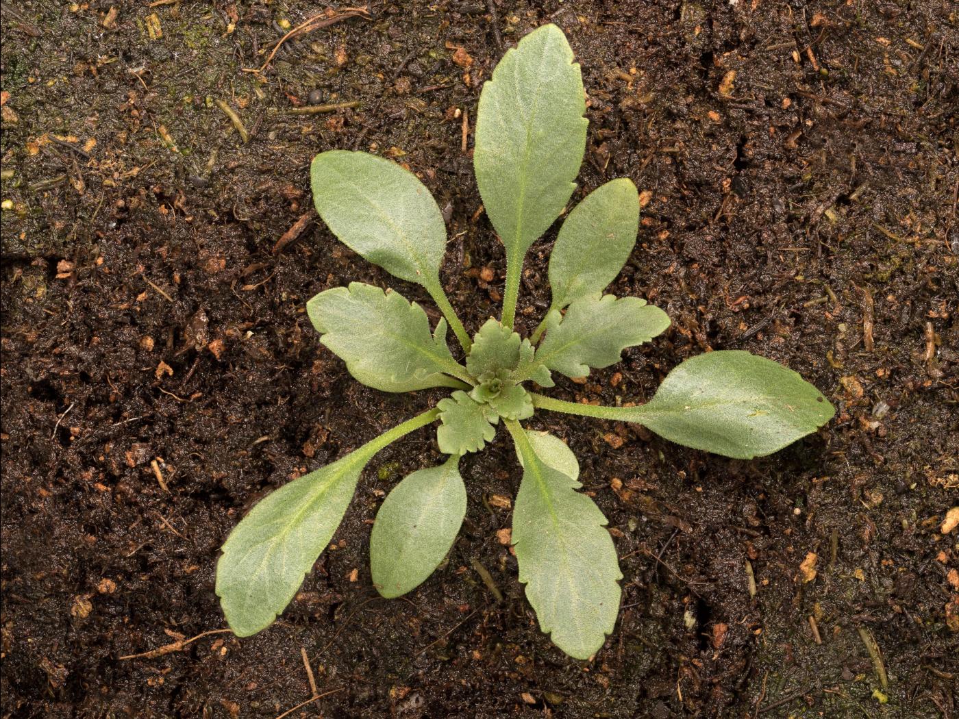 La plantule est à rosette, les 2 premières feuilles sont opposées, les suivantes sont alternes. Les cotylédons sont de forme allongée avec un sommet arrondi. Ils sont de couleur vert foncé avec un pétiole à base parfois rougeâtre et mesurent de 10 à 15 mm de longueur. Les premières feuilles sont ovales à allongées et la marge est entière.