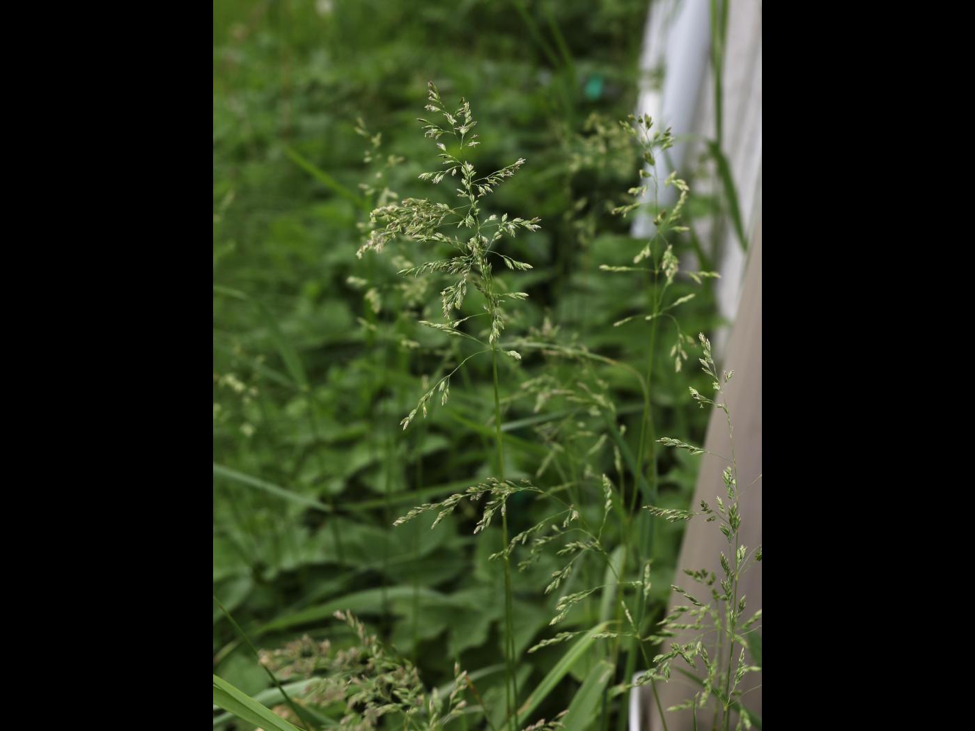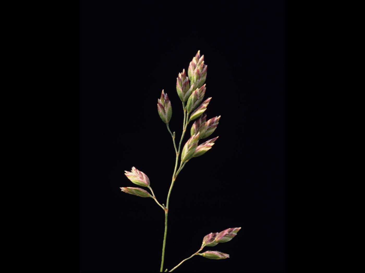 L’inflorescence est une panicule ouverte, de forme triangulaire et souvent teintée de pourpre. Elle mesure de 8 à 15 cm de longueur. Les branches mesurent de 2 à 9 cm de longueur et sont regroupées par paquet de 3 à 5 branches sur l’axe principal. Les épillets sont courts et aplatis, ils mesurent de 3 à 6 mm de longueur et contiennent de 2 à 5 fleurons. Les glumes sont inégales, la supérieure mesure de 2 à 4,5 mm de longueur et l’inférieure mesure de 1,5 à 4 mm de longueur. Elles sont de forme lancéolée et comprennent de 1 à 3 nervures.