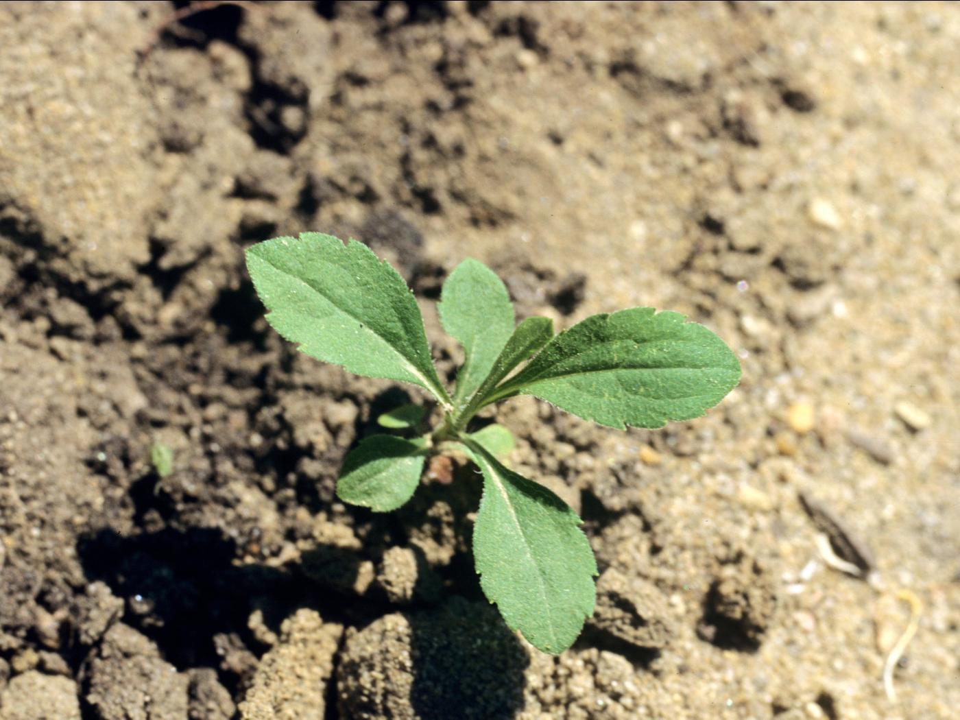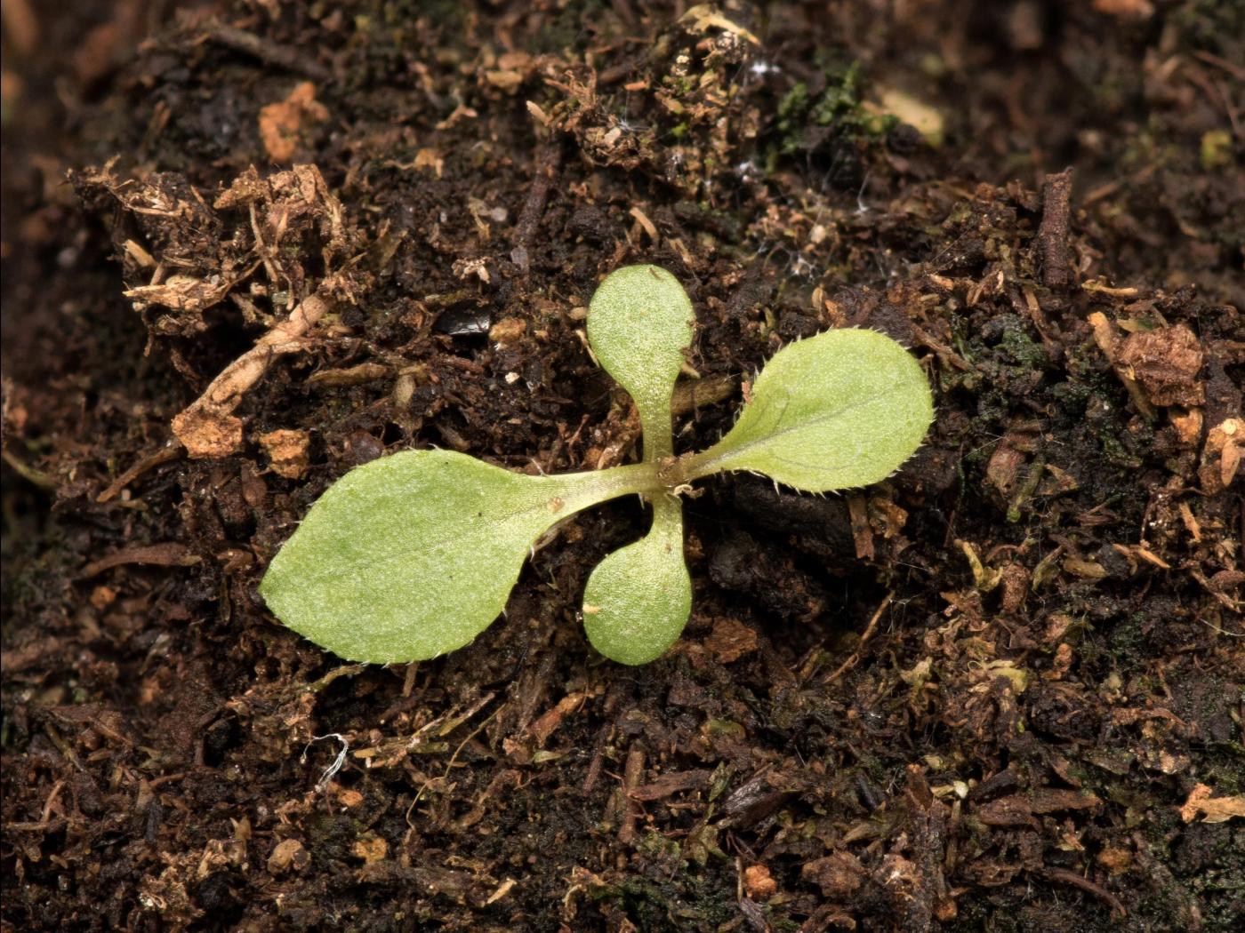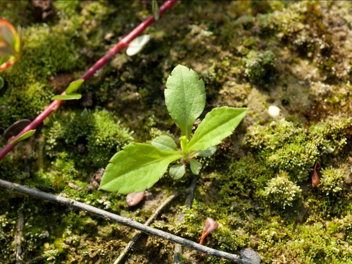 La plantule est composée de feuilles alternes qui forment une rosette. Les cotylédons sont de forme oblongue et mesurent de 1,5 à 2,5 mm de longueur. Les premières feuilles sont pubescentes, de forme arrondie à ovale, le bord du limbe porte de 1 à 2 encoches ou quelques dents grossières. Les cotylédons se dessèchent rapidement après l’apparition des feuilles.