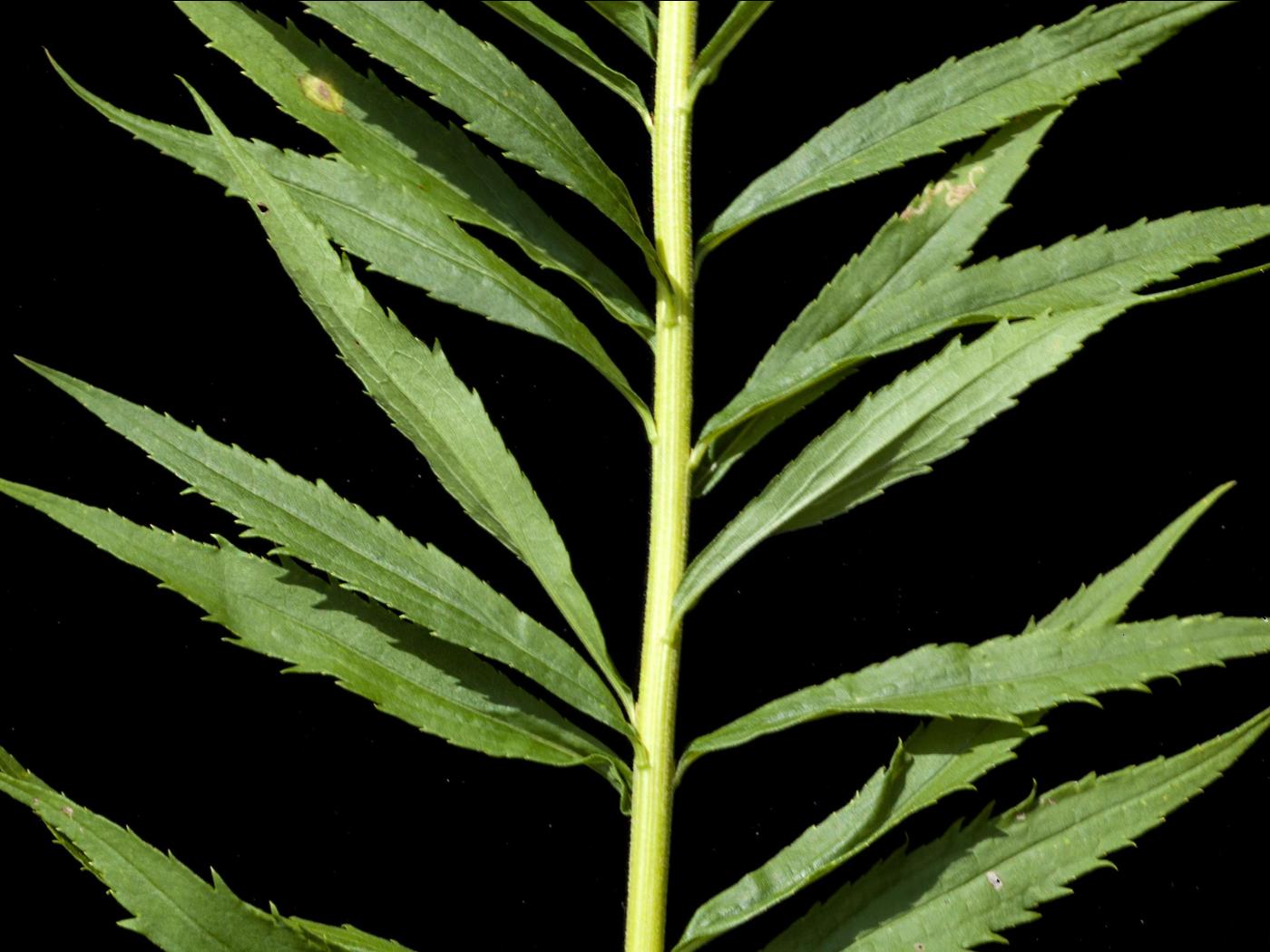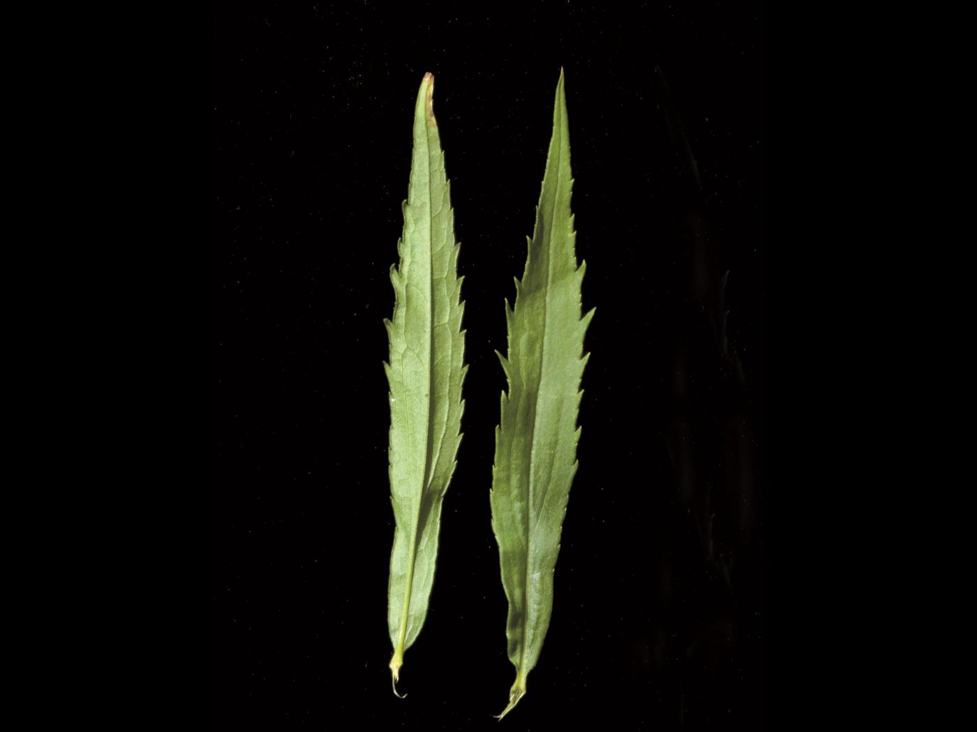 Les feuilles sont alternes et sessiles sur la tige. Elles sont légèrement rugueuses au toucher et présentent une pubescence blanchâtre sur la face inférieure. Les feuilles matures sont de forme lancéolée à allongée et se terminent en pointe. La marge du limbe est dentée. Elles mesurent de 5 à 15 cm de longueur et de 1 à 3 cm de largeur. Elles portent 3 nervures apparentes naissant de la nervure principale.
