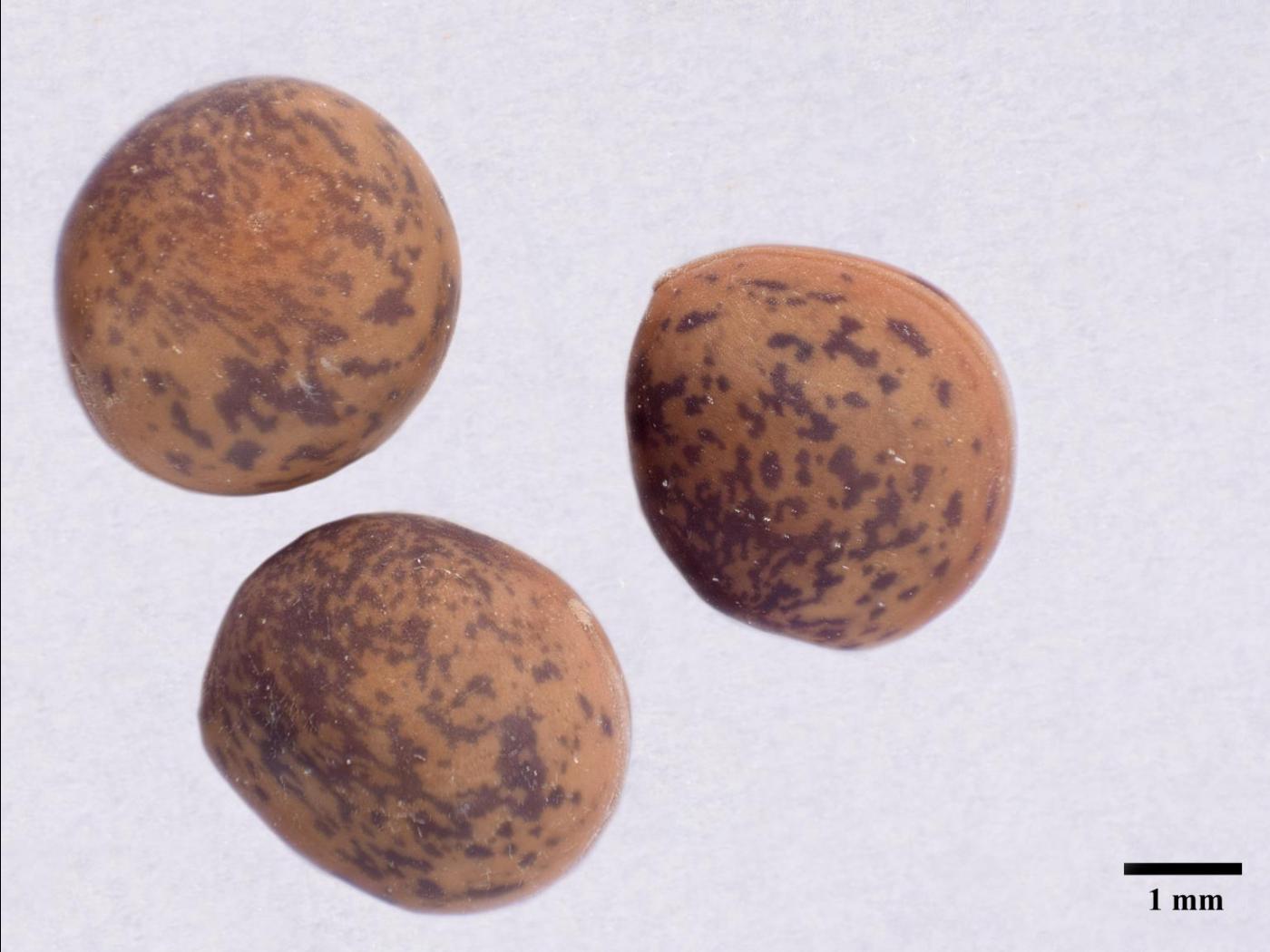 Les fruits sont des gousses (légumes) aplaties de couleur brun clair à noir. Elles mesurent de 2 à 5 cm de longueur et contiennent de 5 à 8 graines. Ces dernières sont de forme sphérique à arrondie, mesurent entre 2,5 et 3,5 mm de diamètre et sont de couleur brun rougeâtre parfois légèrement tachetées.