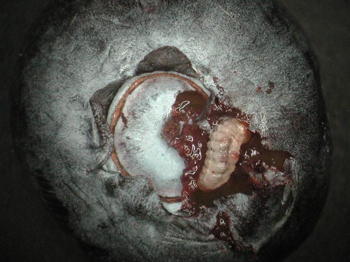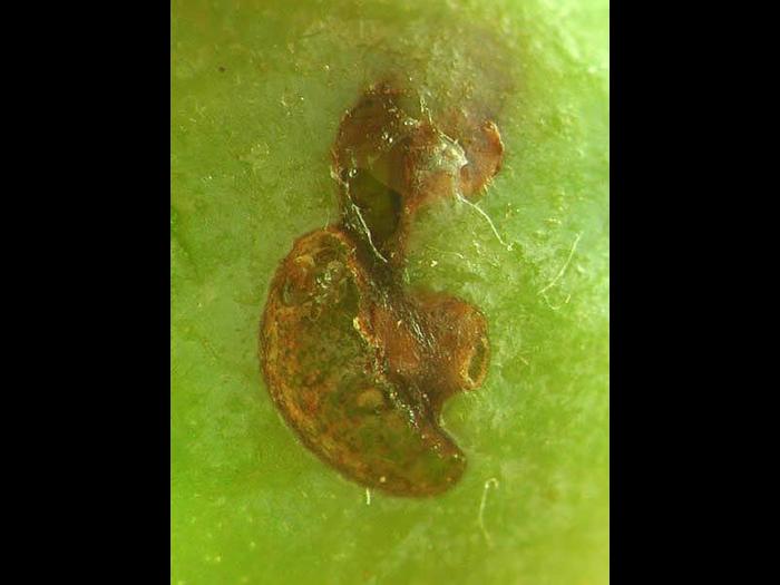 Bleuet présentant un dégât d'alimentation d'un adulte de charançon de la prune. La forme du dégât est plus arrondie que la cicatrice de ponte qui est en forme de croissant. Ce type de dommage s'observe sur les fruits mûrs (à l'automne) alors que les cicatrices de ponte s'observent surtout sur les fruits verts.