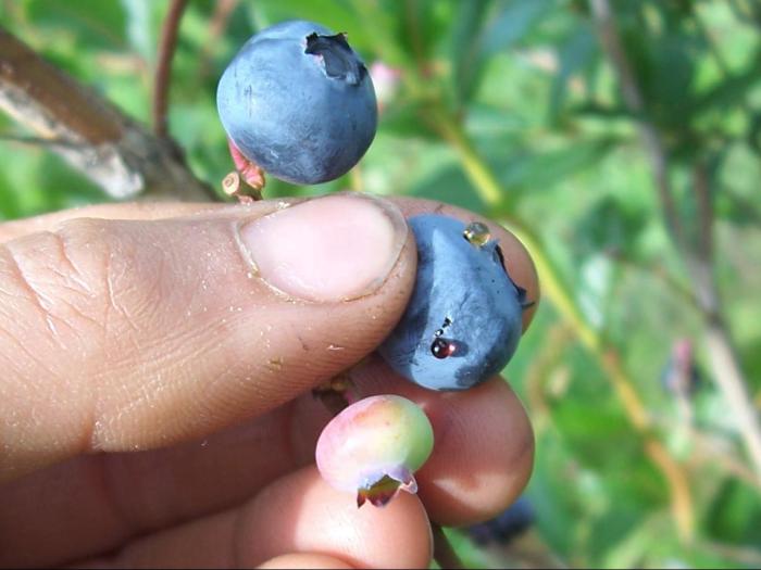 Bleuet attaqué par des larves de drosophile à ailes tachetées. Le fruit, lorsqu'il est pincé légèrement, sécrète une petite quantité de liquide, formant parfois une petit goutte à l'extérieure de celui-ci.