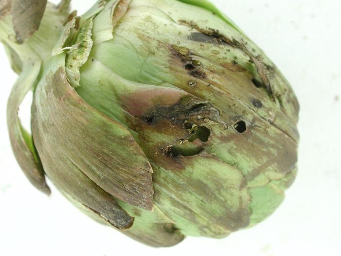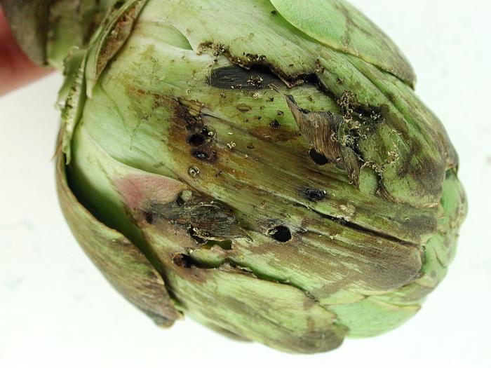 Fleur d'artichaut attaquée par une larve de pyrale du maïs : lorsqu'elle s'attaque à la fleur d'artichaut, Ostrnia nubilalis creuse une galerie qui traverse les multiples sépales. On observe donc un ou plusieurs trous ainsi que des fèces sur chacun des sépales traversés par la galerie.