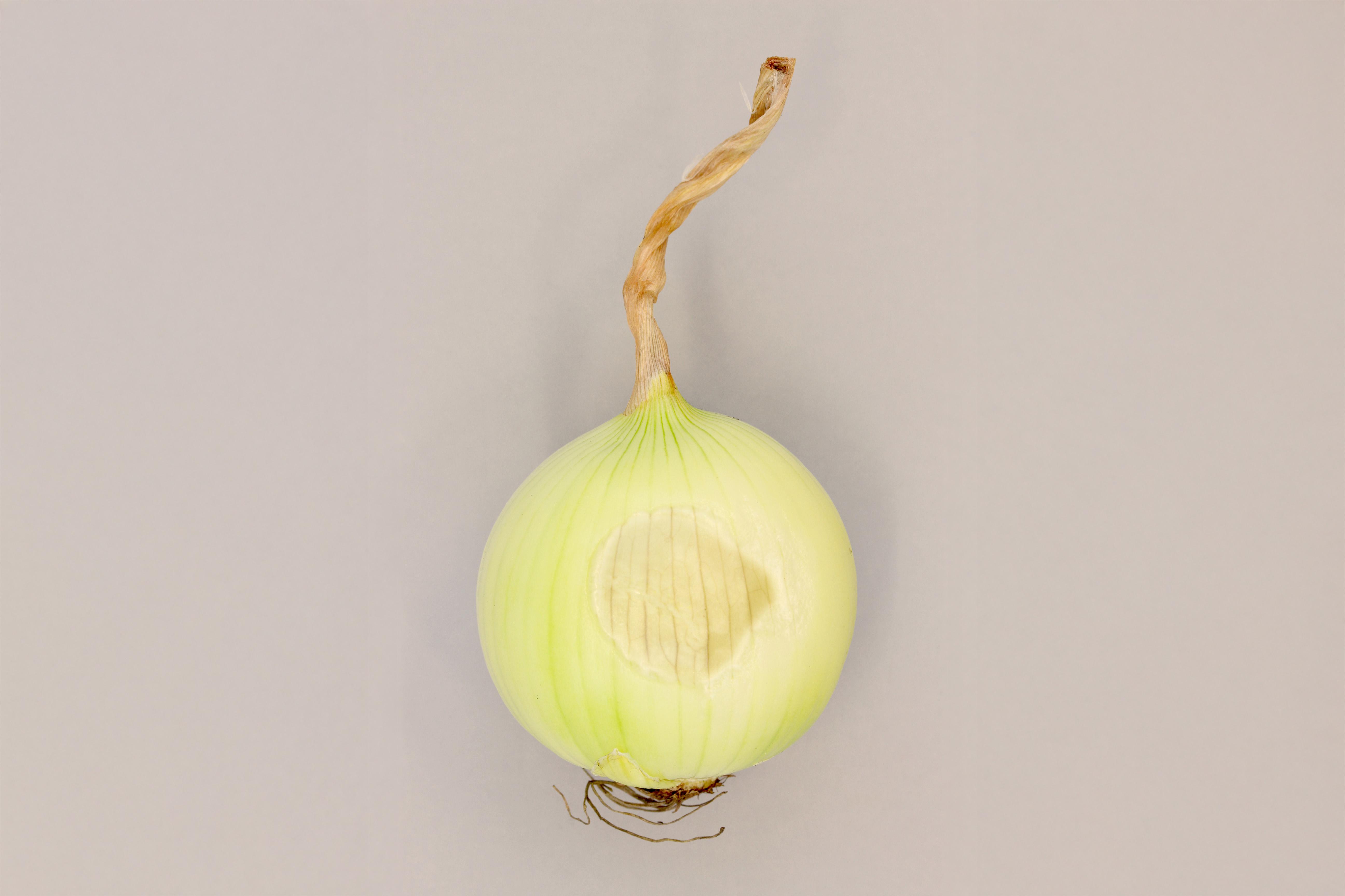 Sous les tuniques sèches d’un oignon rouge, présence d’une grande tache blanchâtre dont le centre est mou. La tache est sur un seul côté du bulbe. Ce symptôme est caractéristique d’une insolation (journée très ensoleillée), jumelée à une température élevée et des conditions sèches. Cet échantillon provient d’un champ où les oignons étaient arrachés et séchaient en andain sur une terre noire. Les bulbes qui étaient sur le dessus sont les plus affectés, car ils sont exposés directement aux rayons du soleil.