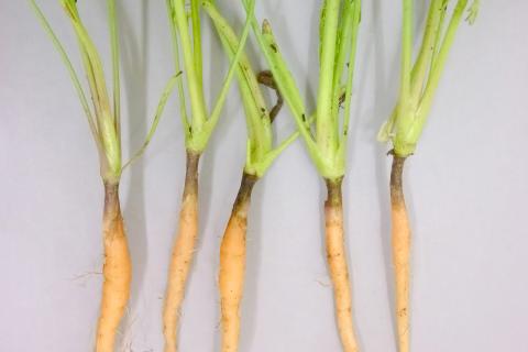 Sur de jeunes plants de carottes (cv 'Endy') cultivés au champ, présence d’une constriction brunâtre, liégeuse et superficielle au collet. Les feuilles jaunissent, brunissent ou dépérissent sur les plants. La racine est sans symptôme. Ce symptôme est typique d’un chancre de chaleur causé par des températures élevées à la surface du sol. Les plants affectés (10 %) sont cultivés en terre noire et distribués en foyer, au centre du champ. Il y avait probablement des îlots de chaleur à cet endroit.