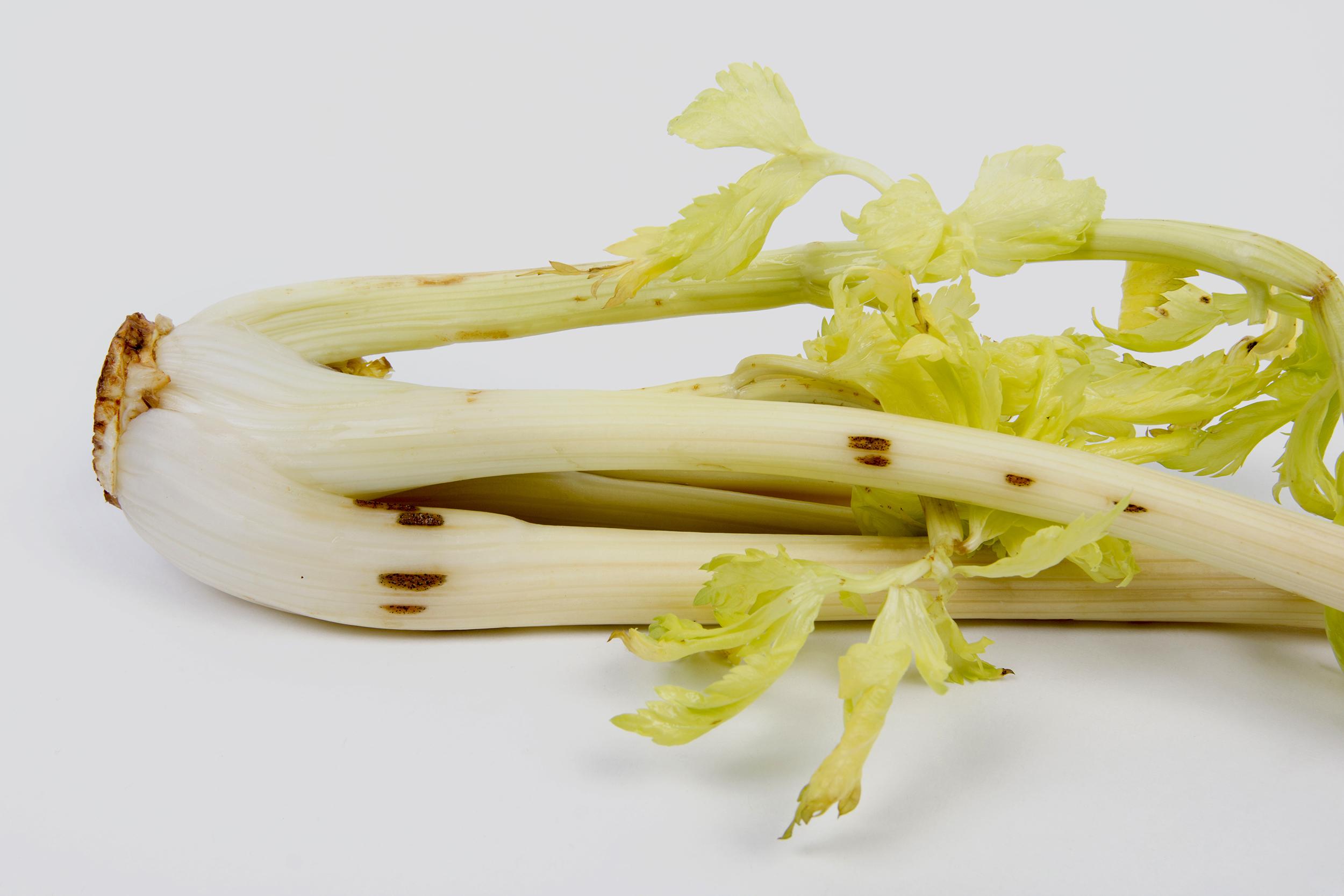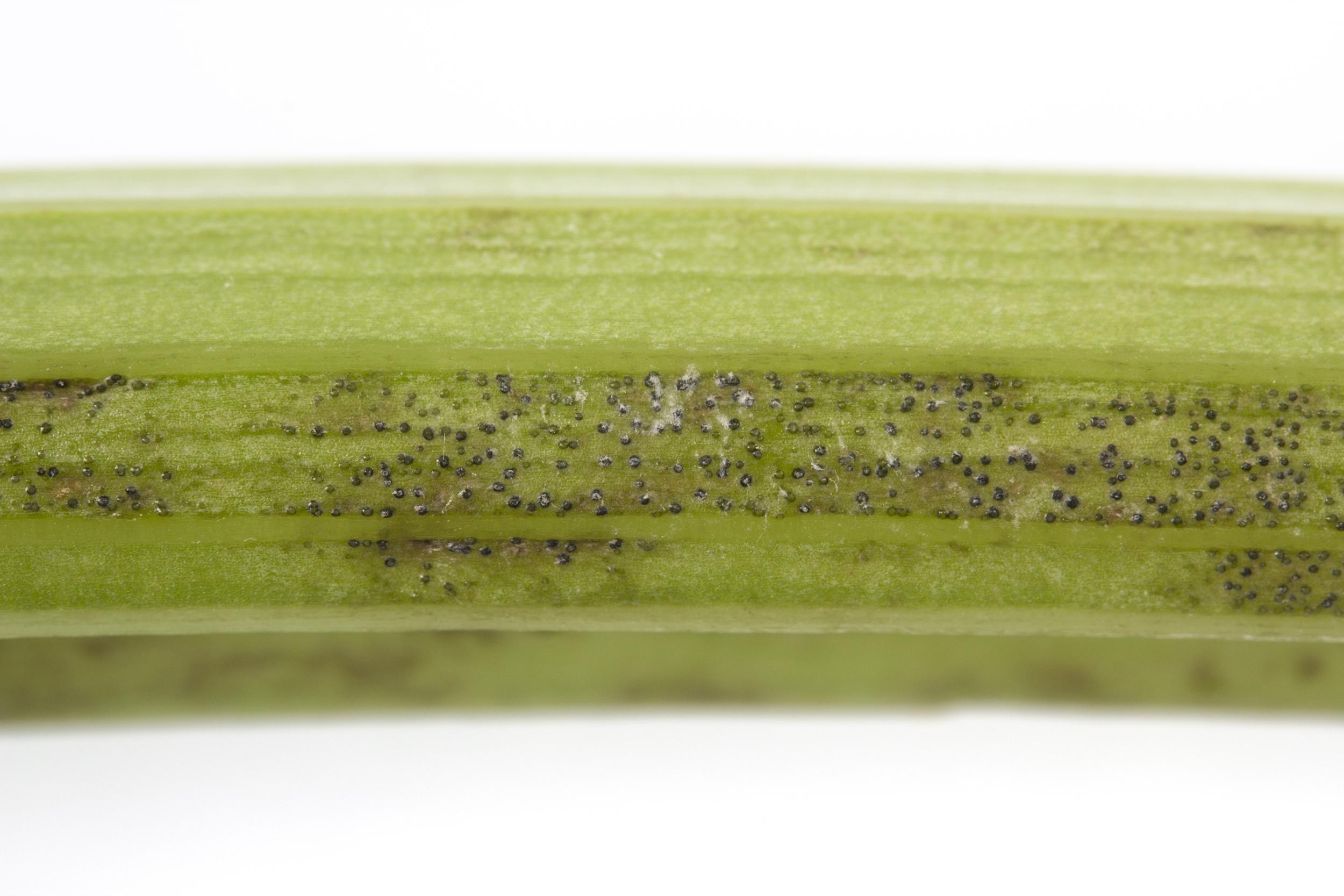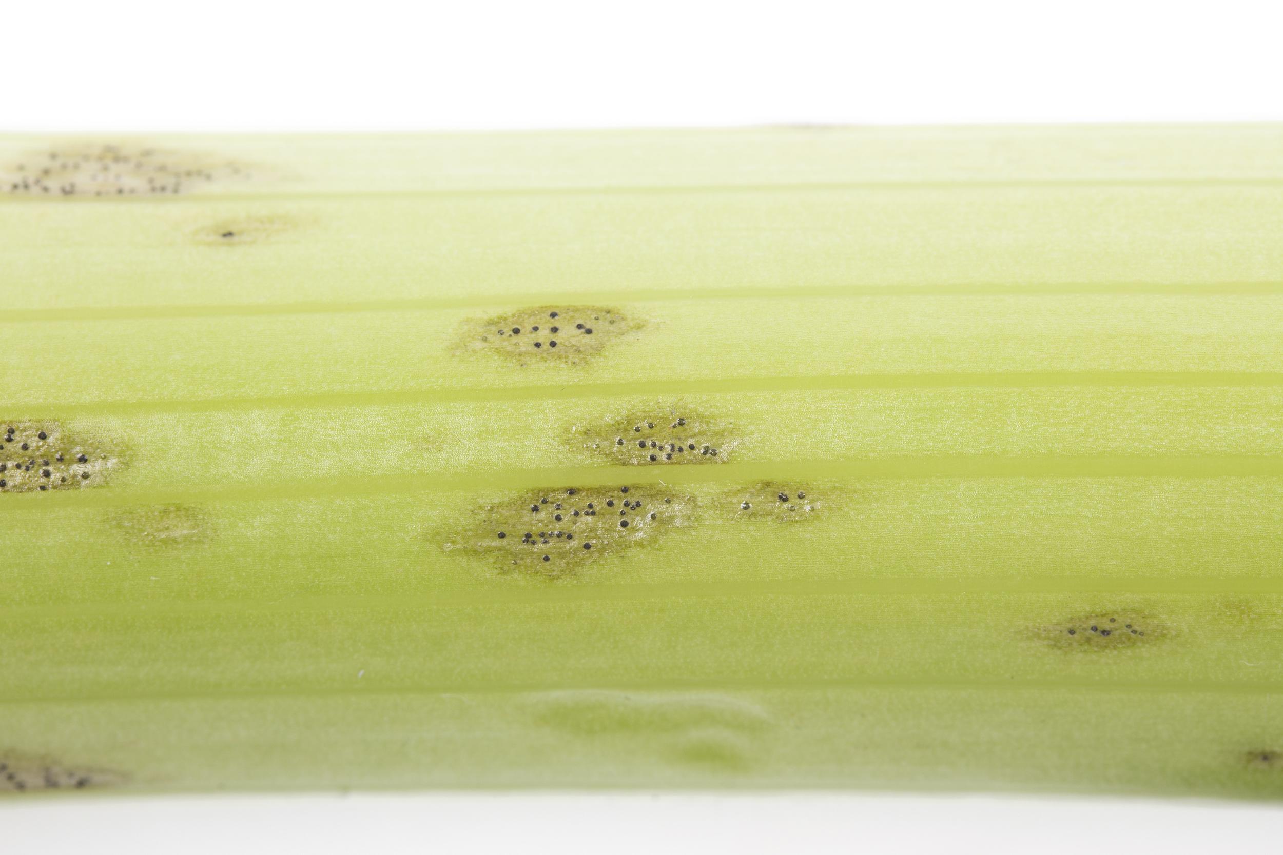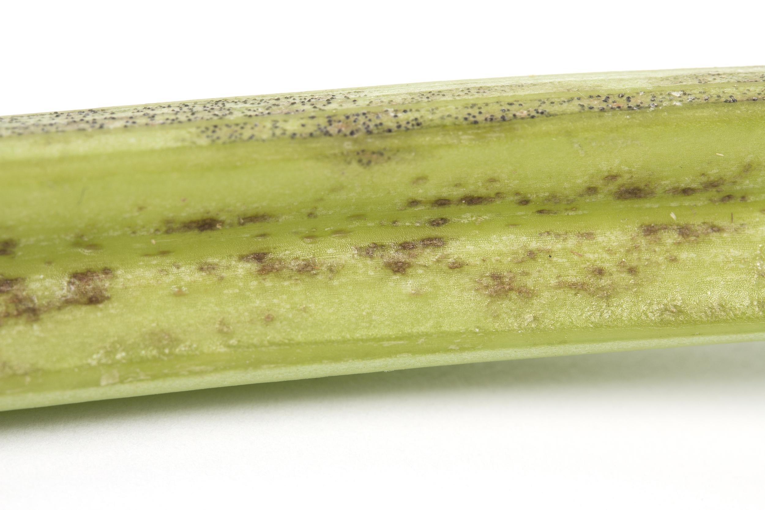 Les pétioles de céleri montrent des taches beiges à brunes de forme allongées. Les taches portent de minuscules ponctuations noires, qui correspondent aux pycnides de Septoria apiicola, responsable de la tache septorienne du céleri.