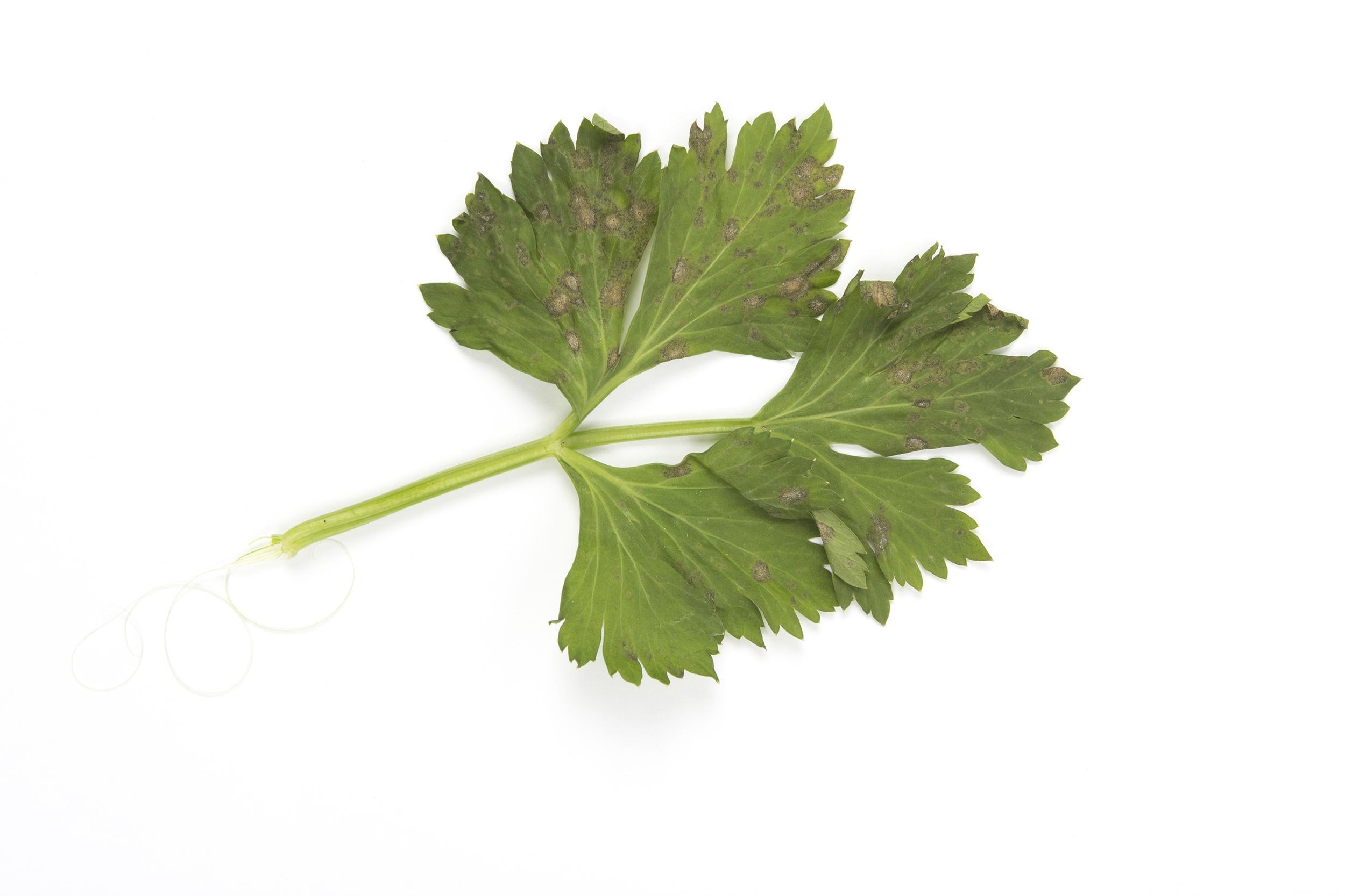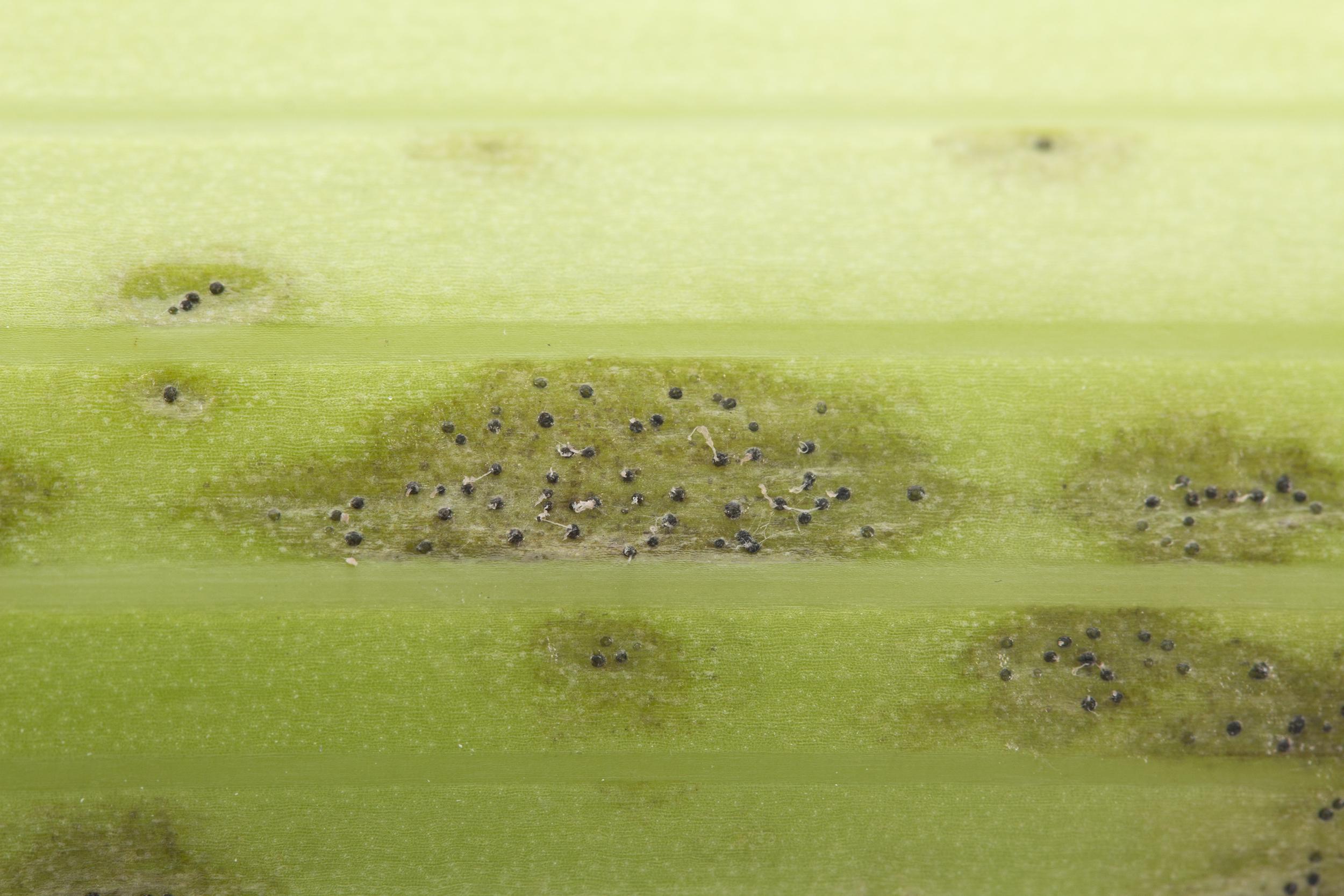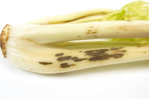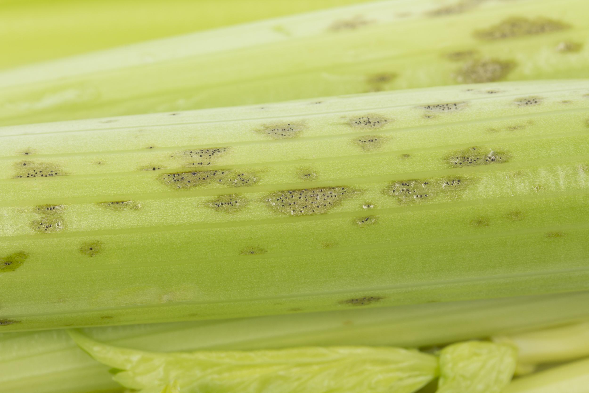 Les pétioles de céleri montrent des taches beiges à brunes de forme allongées. Les taches portent de minuscules ponctuations noires, qui correspondent aux pycnides de Septoria apiicola, responsable de la tache septorienne du céleri.