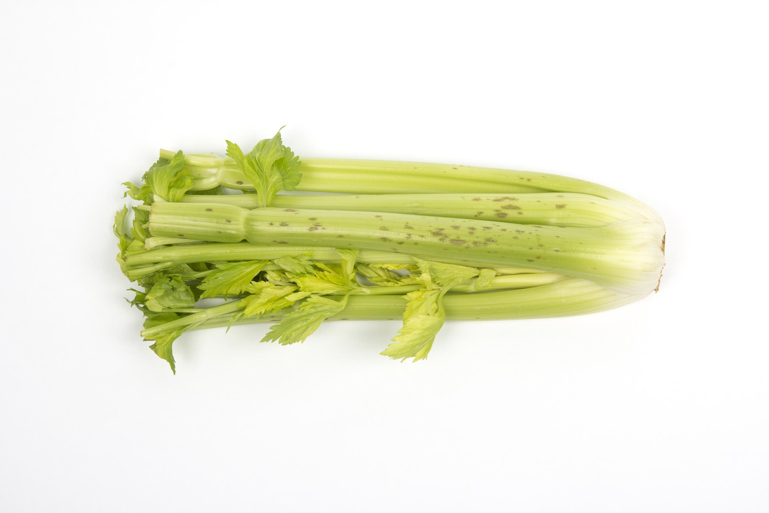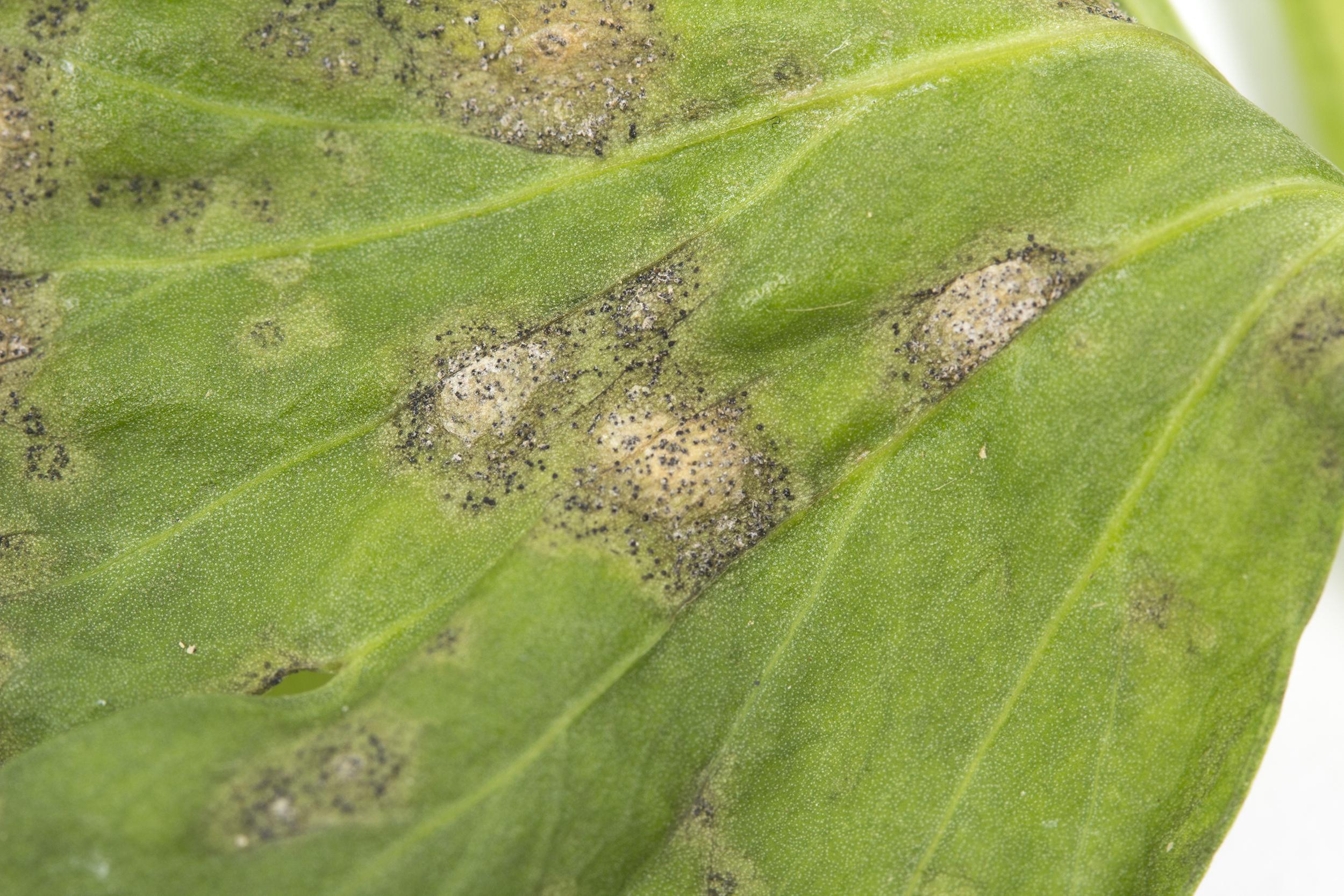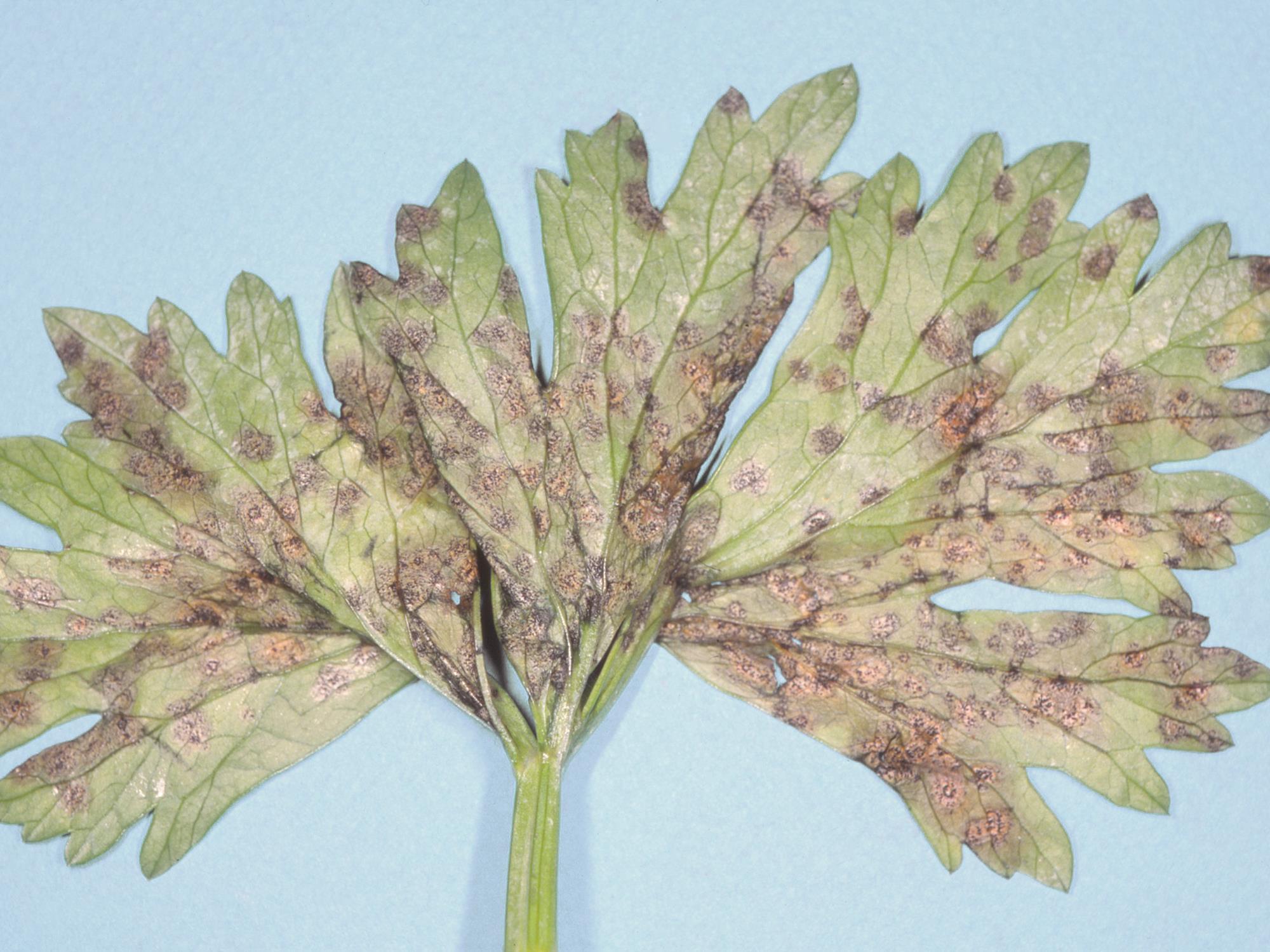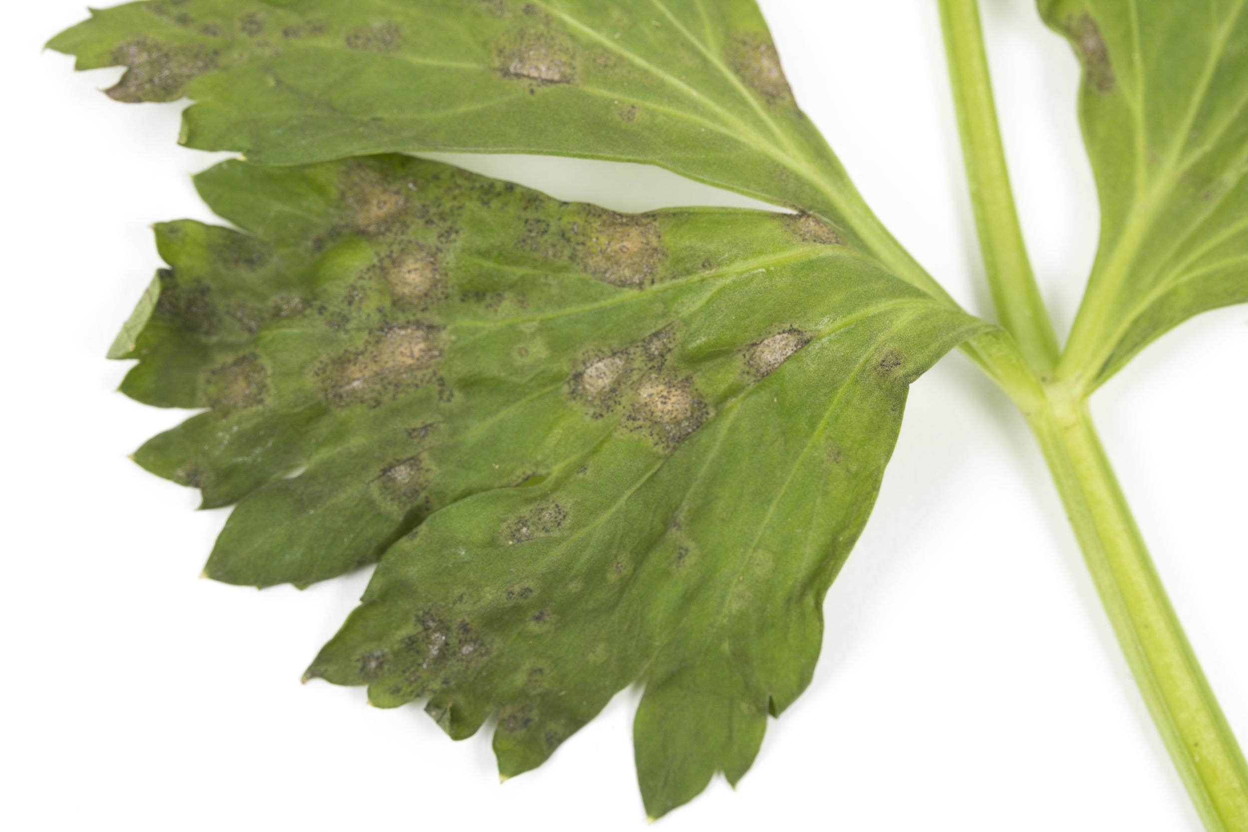 Les pétioles de céleri montrent des taches beiges à brunes de forme allongées. Les taches portent de minuscules ponctuations noires, qui correspondent aux pycnides de Septoria apiicola, responsable de la tache septorienne du céleri.