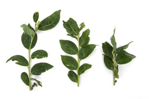 Sur ce plant de bleuet en corymbe (cv. Duke) co-infecté par le virus latent du bleuet (BBLV) et le virus de la mosaïque du bleuet (BlMaV), on observe des malformations importantes au niveau des feuilles. Les nervures principales sont sinueuses, ce qui donne un aspect froissé aux feuilles. Les nervures secondaires réticulées sont élargies et claires. Ce symptôme n'est pas typique d'une infection causée par le BlMaV.