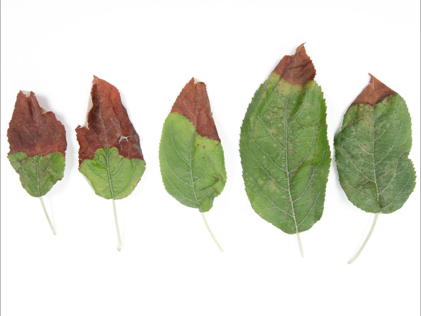 Feuilles : déformation (feuilles gaufrées, concaves, plissées, étroites avec tissus calleux), nervures parallèles à la nervure principale et jaunissement des points de croissance.