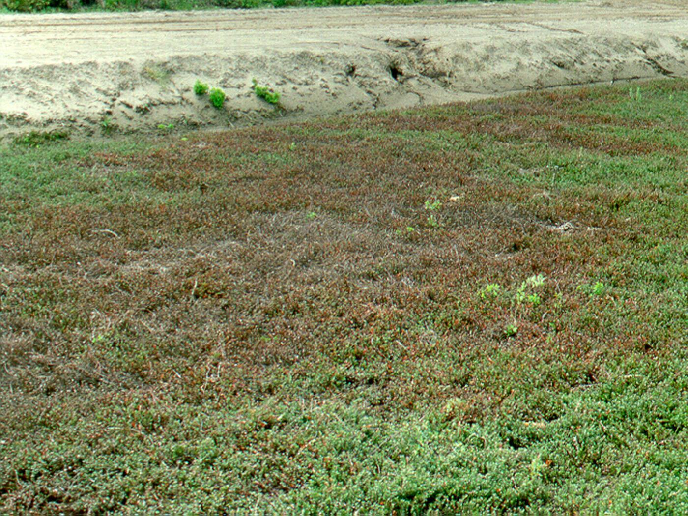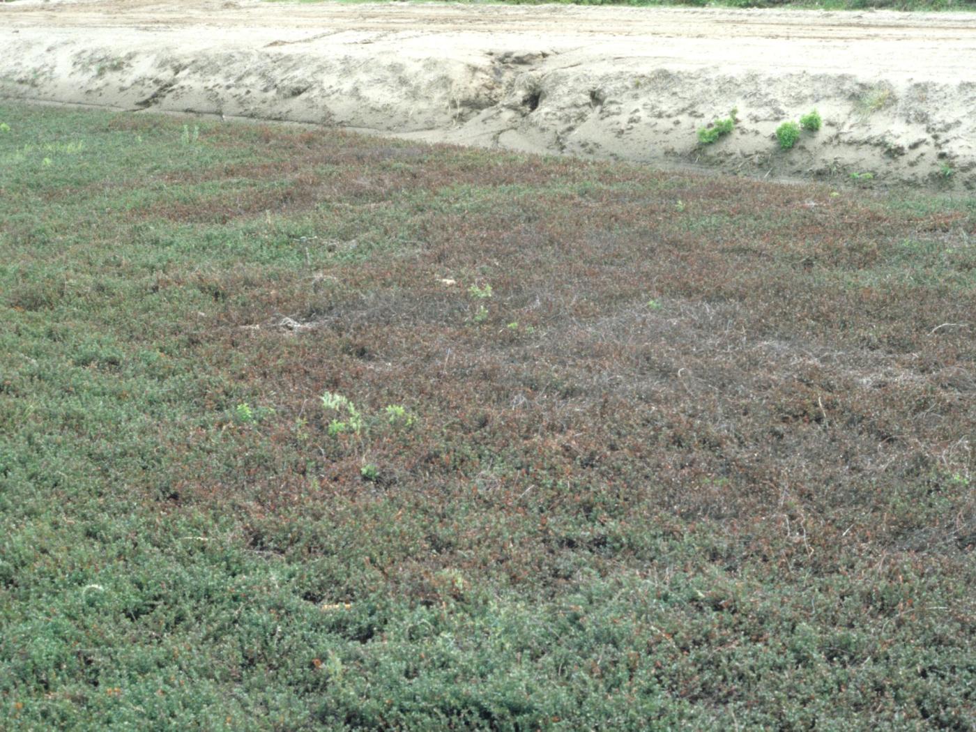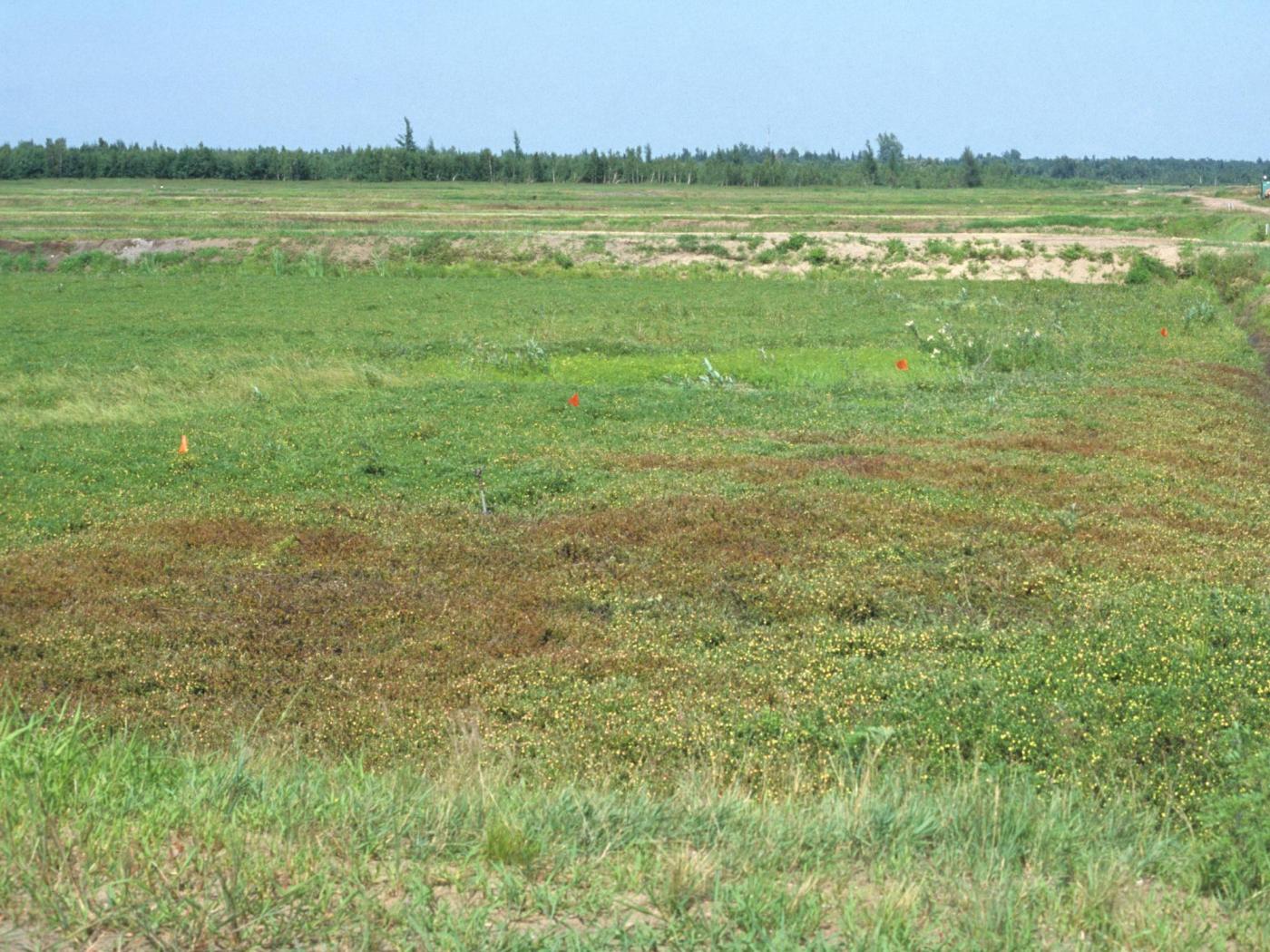 Description: Une vue d'ensemble de l'extrémité d’un champ de canneberge qui a reçu une application printanière de l’herbicide dichlobénil (Casoron). Le feuillage des plants est devenu rouge à brun. C’est probablement le chevauchement des zones traitées qui est à l’origine de ce symptôme.