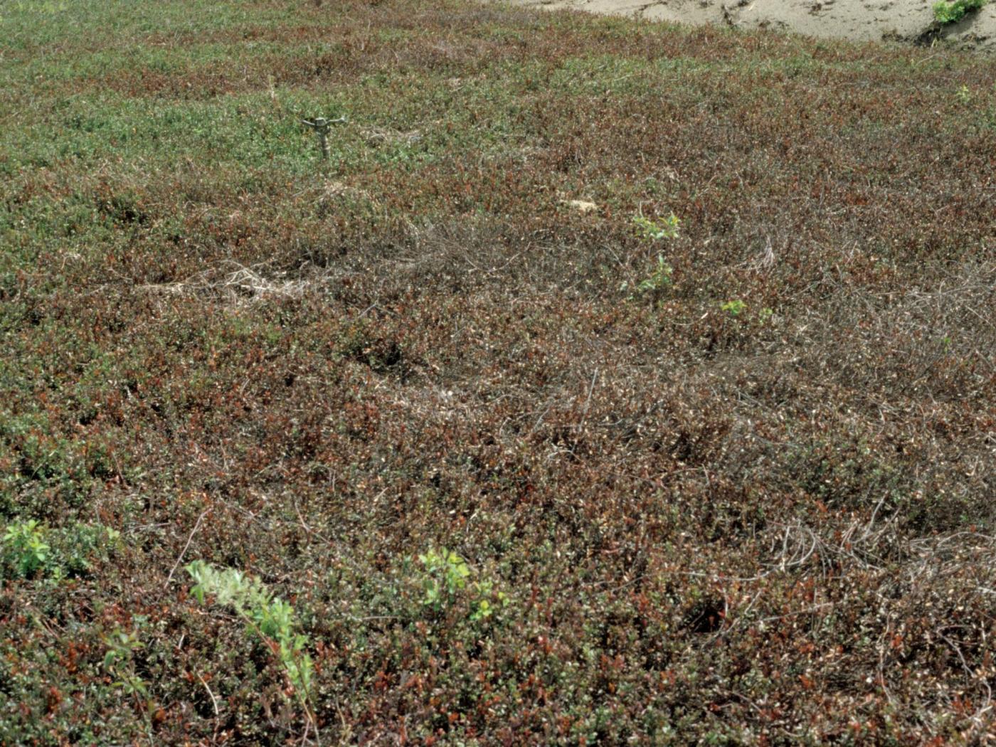 Description: Une vue rapprochée du feuillage des plants de canneberge qui est devenu rouge à brun à la suite d’une application printanière de l’herbicide dichlobénil (Casoron). C’est probablement le recoupement des zones traitées, à l’extrémité du champ, qui est à l’origine de ce symptôme.