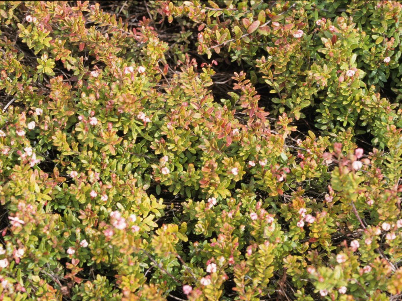 Légende: Rougissement du feuillage à l'extrémité des tiges de canneberge