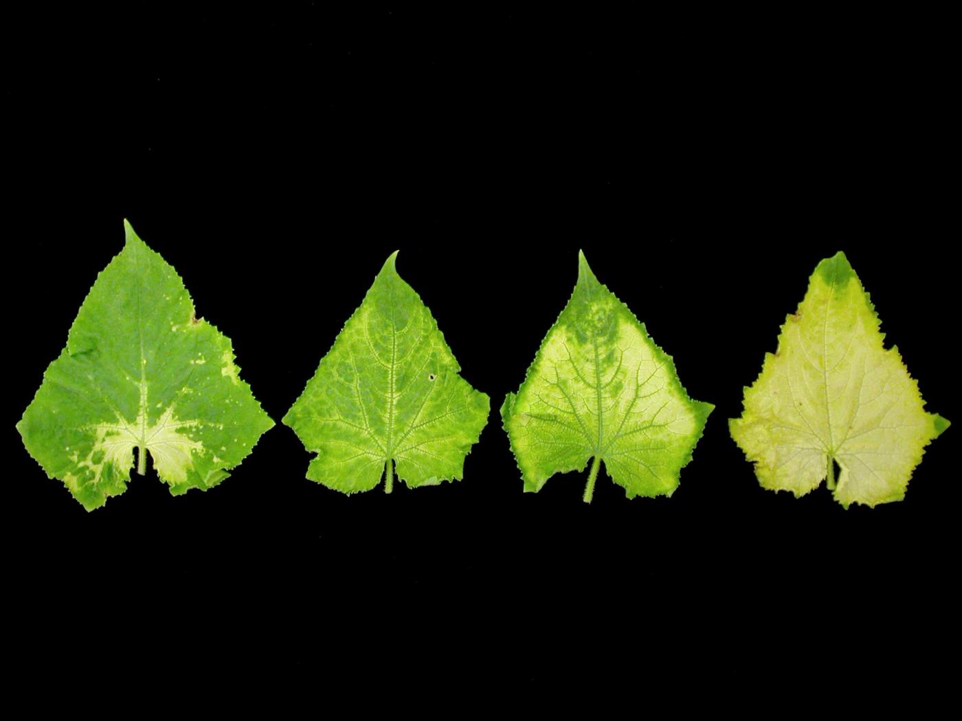 Description: Les feuilles de concombres libanais cultivés en serre présentent un jaunissement varié apparaissant à divers endroits. De gauche à droite, nous observons : 1) un jaunissement du limbe et des nervures principales, à la base de la feuille, 2) un jaunissement généralisé des nervures, 3) un jaunissement généralisé du limbe avec des nervures vertes et du gaufrage du limbe vert et 4) une marge verte sur le limbe jaune.   L'analyse réalisée par le Laboratoire d'expertises et d'analyses alimentaires (LE… En savoir plus