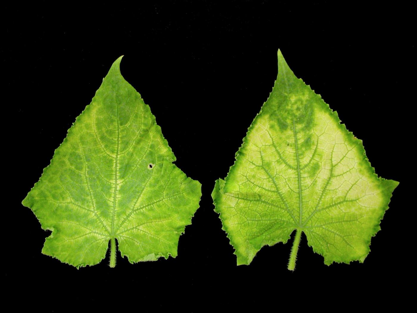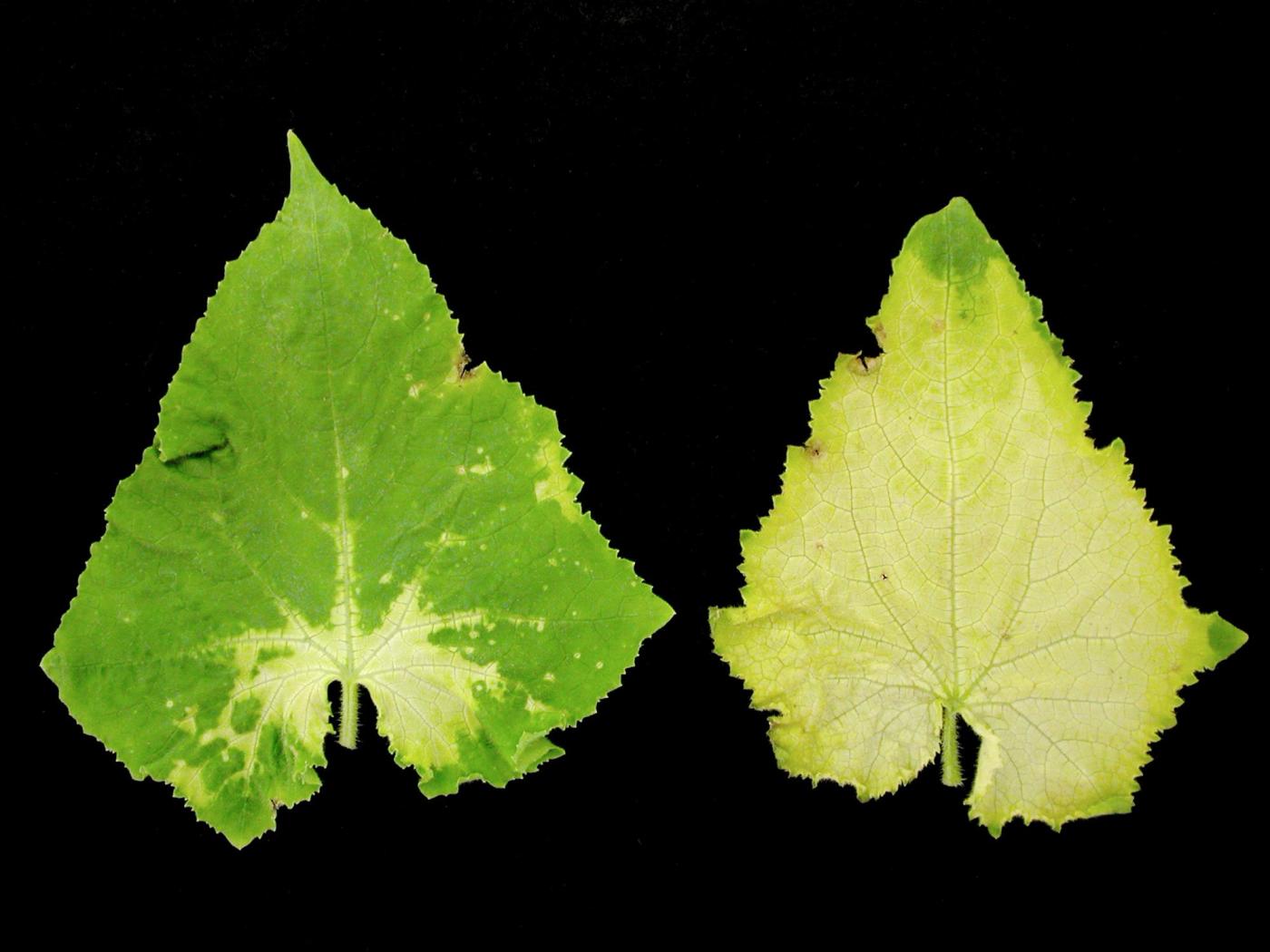 Feuille : les jeunes feuilles et les points de croissance présentent des anomalies de coloration (jaune ou blanc) et des malformations (limbe réduit, feuille effilée ou petite, enroulement). Les nervures demeurent vertes.