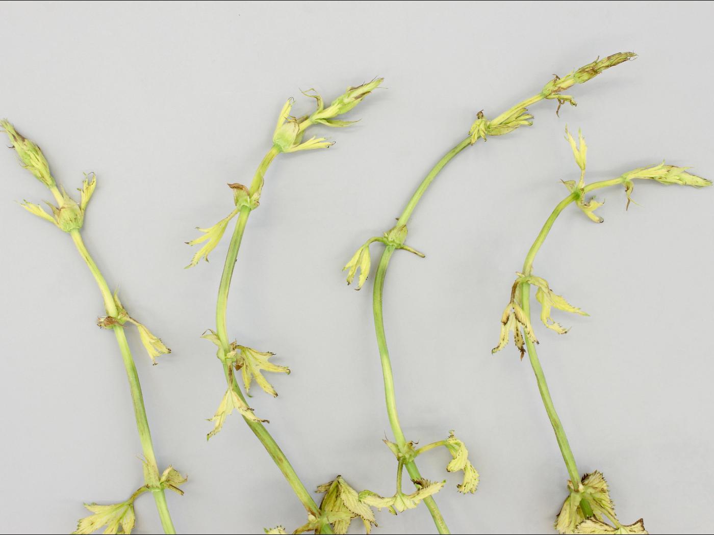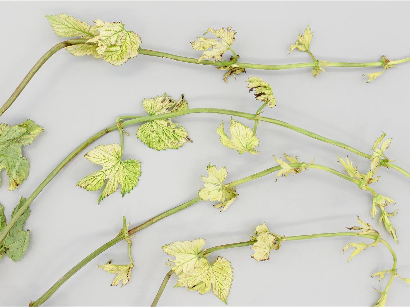 Description: Des sections de tiges feuillées de houblon mesurant environ 30 cm de longueur montrent un blanchiment à jaunissement du limbe entre les nervures qui demeurent vertes. Quelques brûlures foliaires sont observées. Les feuilles terminales sont les plus affectées. L’analyse chimique effectuée par le Laboratoire d'expertises et d'analyses alimentaires (LEAA) du MAPAQ a révélé la présence de l’herbicide glyphosate dans les tissus endommagés. Les symptômes observés sur le houblon sont très caractéristiq… En savoir plus