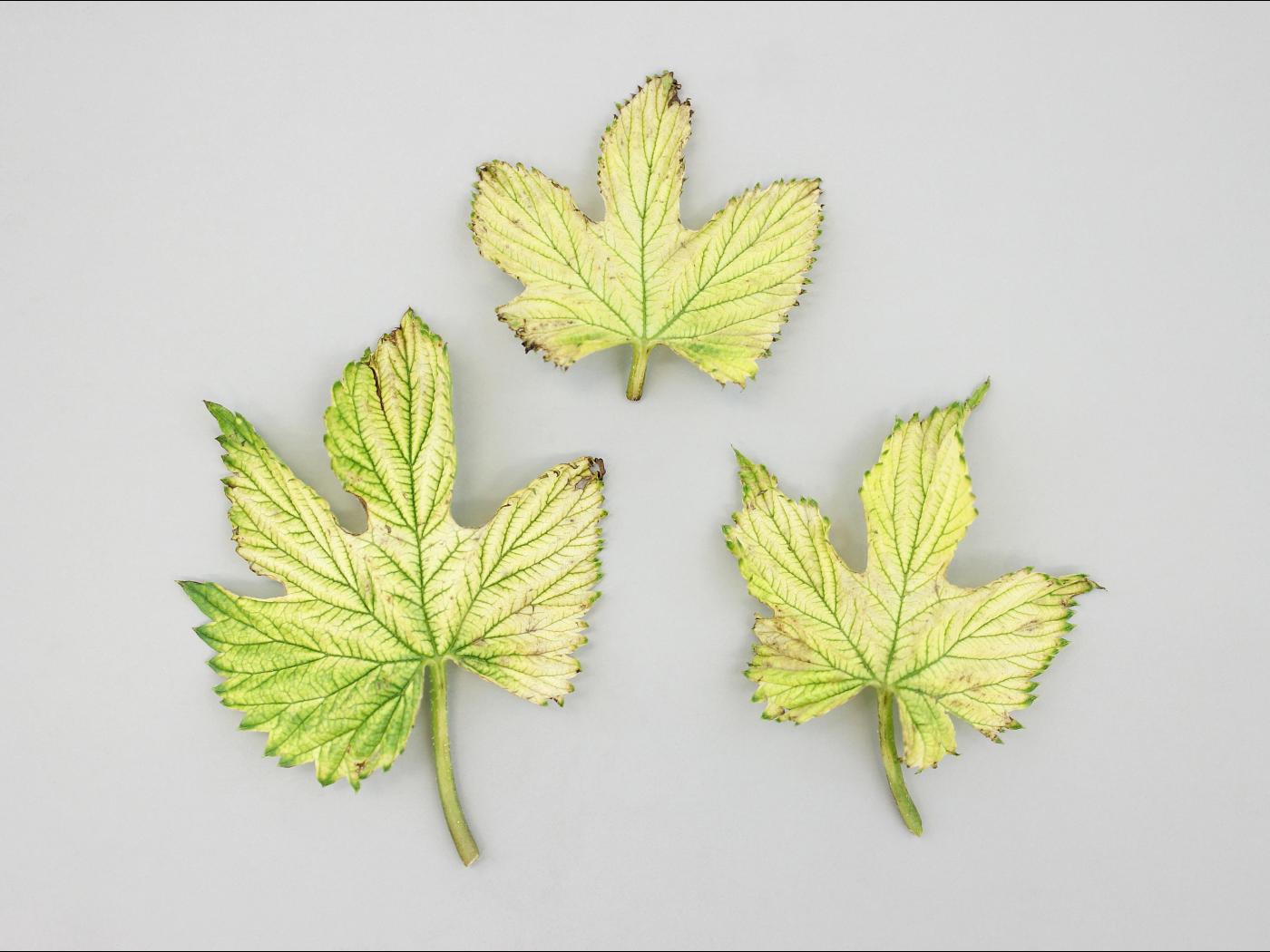 Feuille : présence d’un jaunissement à blanchiment du limbe entre les nervures et de malformations (limbe réduit, feuille effilée ou petite, gaufrage du limbe, feuilles regroupées serrées en rosette). Les nervures demeurent vertes. Des nécroses peuvent être observées.