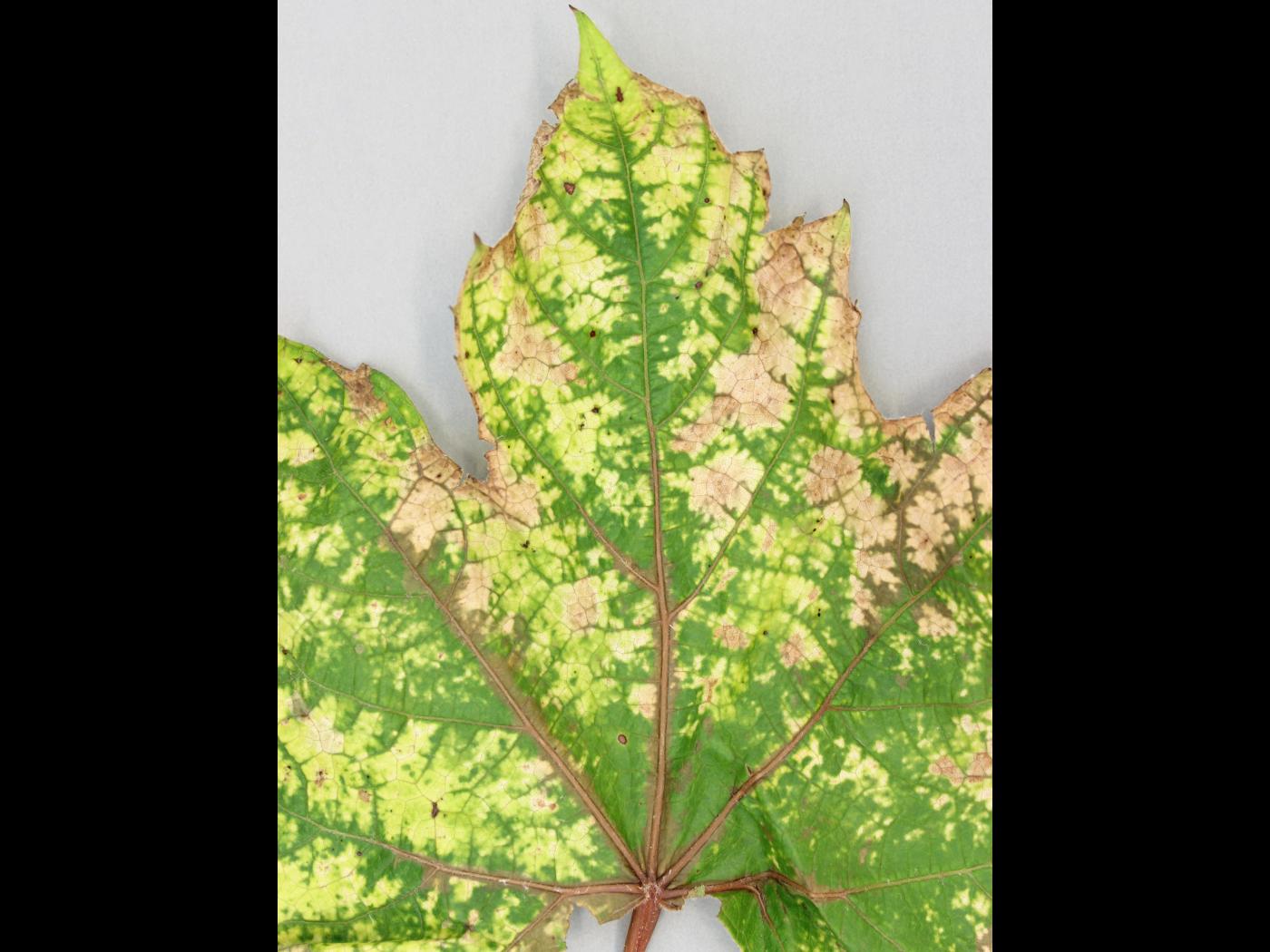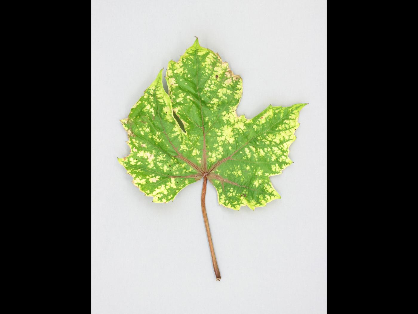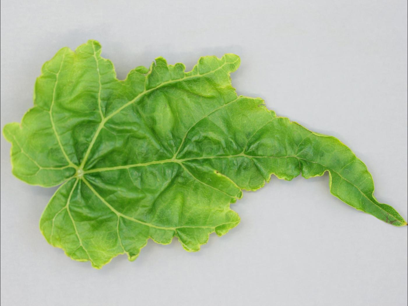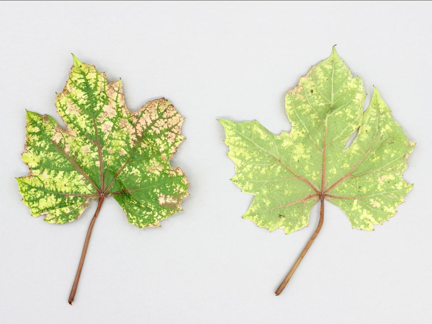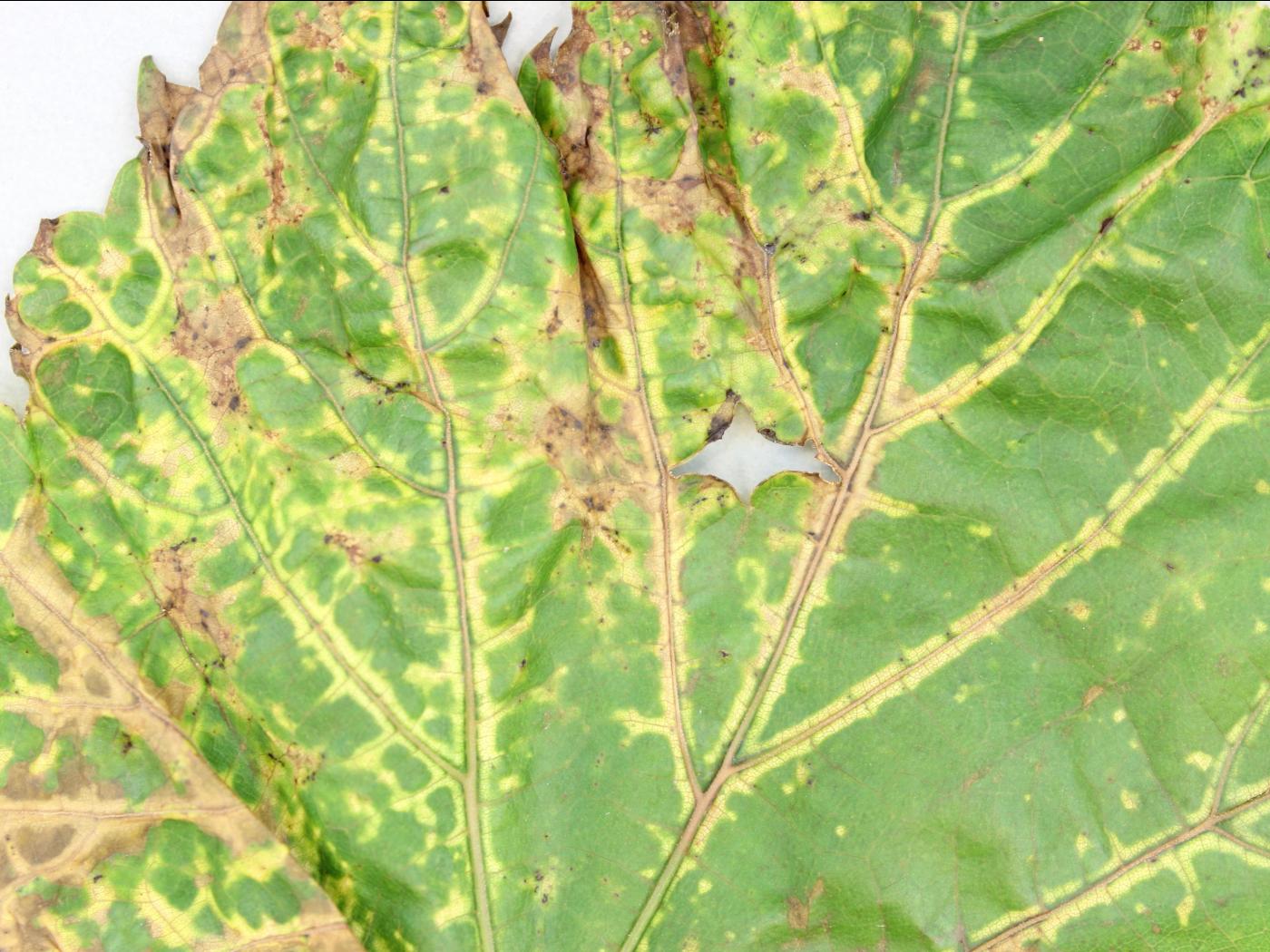 Feuille : les jeunes feuilles et les points de croissance présentent des anomalies de coloration jaunissement internervaire) et des malformations (feuilles recourbées vers le haut, feuilles au limbe réduit, effilée ou petite la deuxième année; enroulement). Les nervures demeurent vertes.