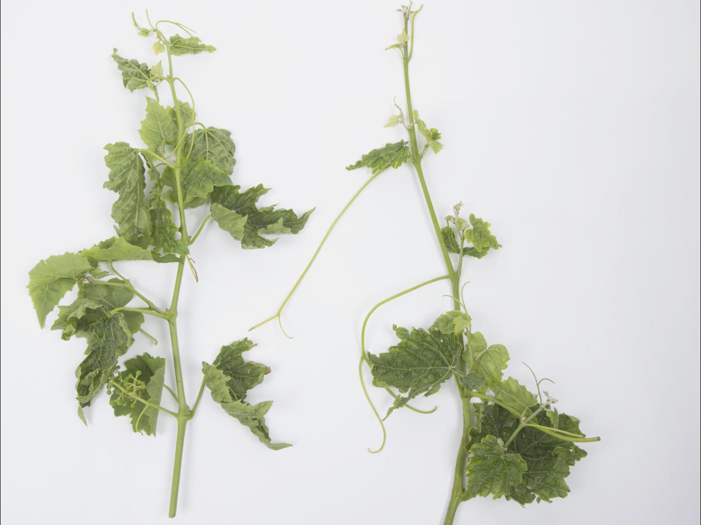 Description: Les feuilles de plants de vigne sont déformées et leur surface gaufrée. Le limbe est plus épais et cassant qu'à la normale. La marge du limbe est craquelée. Les symptômes observés sont attribuables à la concentration importante de glyphosate retrouvée dans les tissus de la plante, suite à un dosage, et qui proviendrait d'une dérive du produit. Le glyphosate est homologué dans la culture de la vigne sur des vignes établies depuis plus de 3 ans.