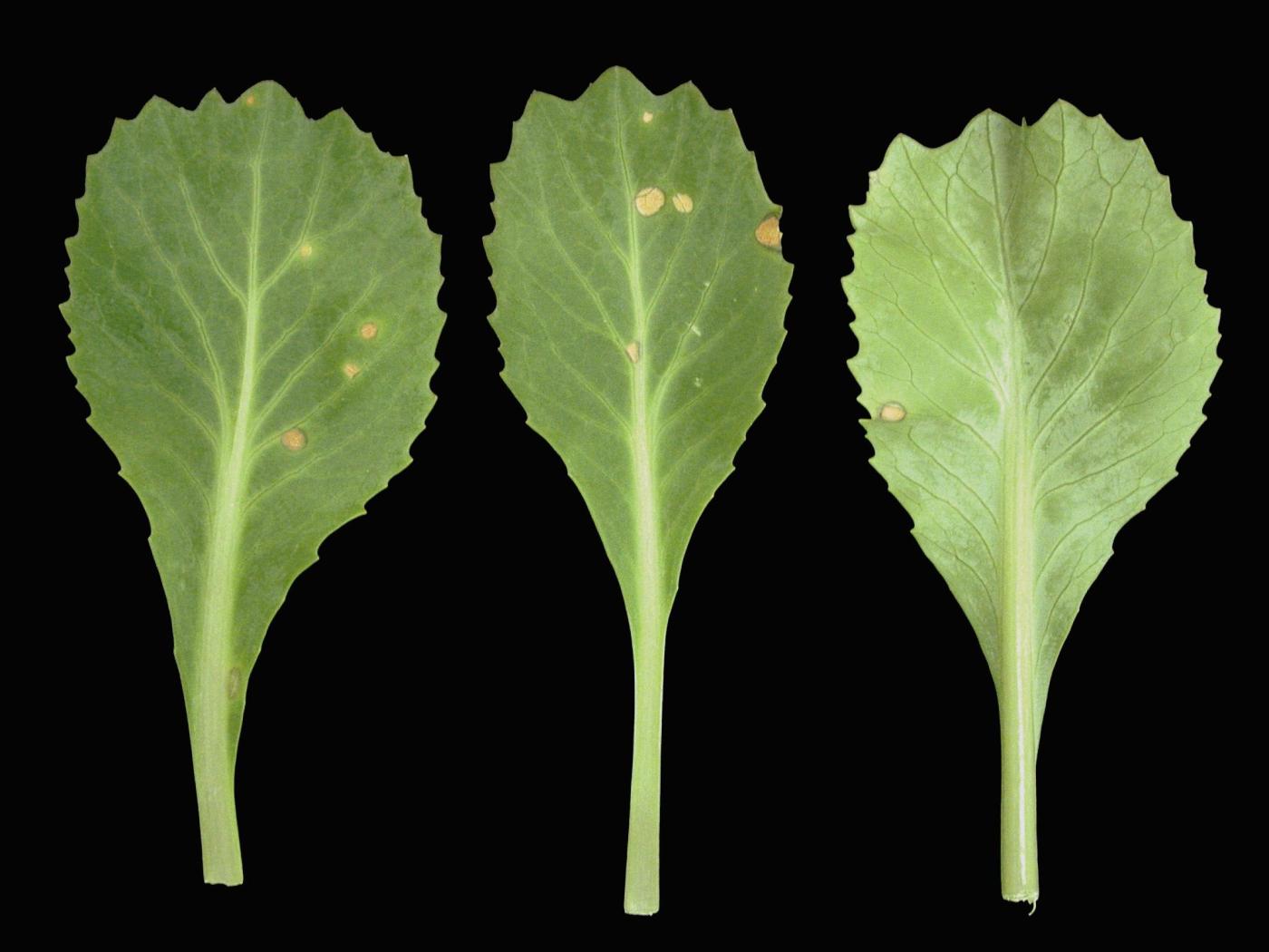 Feuille : présence de taches ou de brûlures brunes et circulaires des tissus touchés seulement. La perte de chlorophylle, pouvant aller jusqu’au blanchiment, et la nécrose des tissus affectés sont caractéristiques.