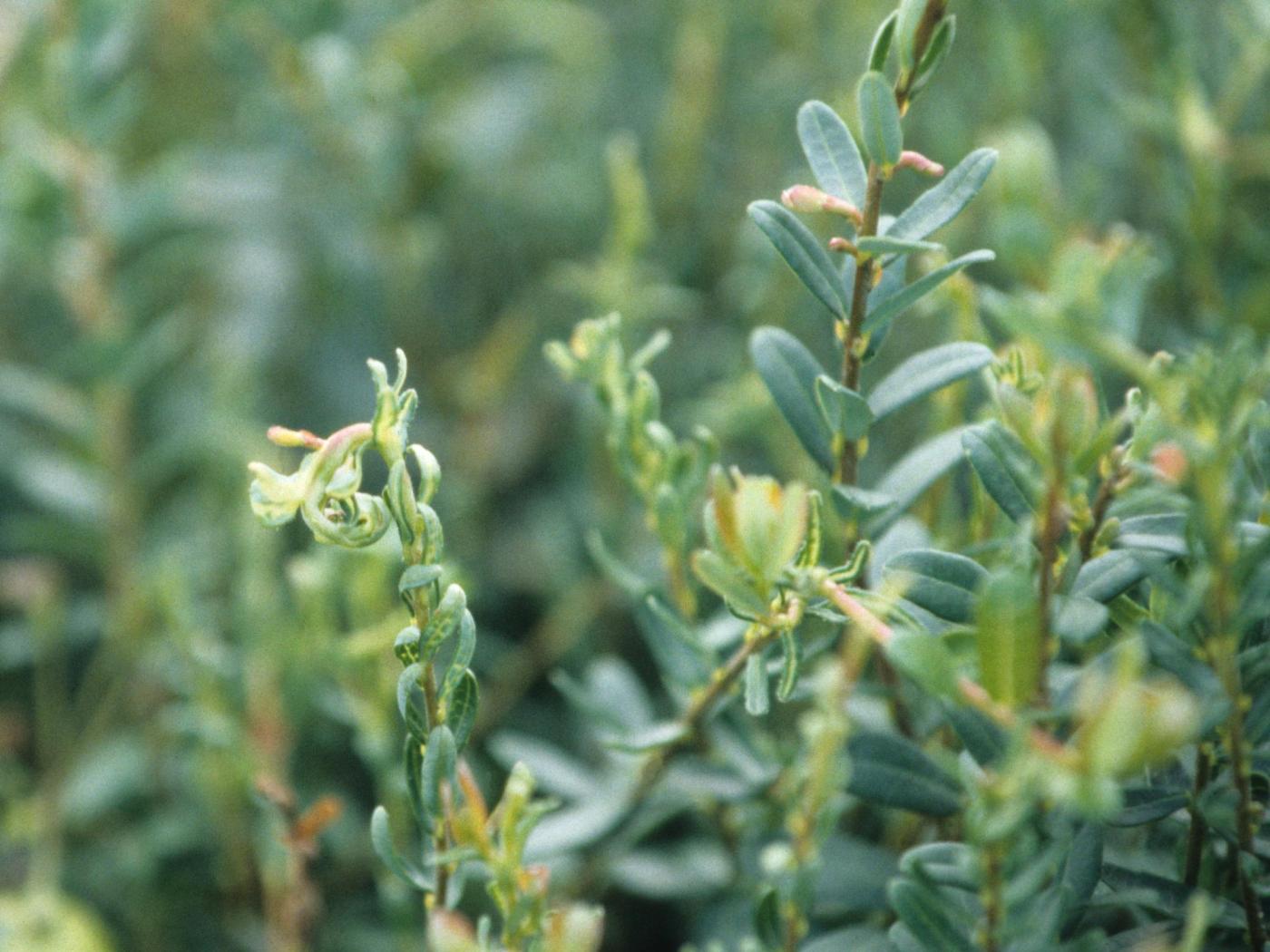 Description: Sur des plants de canneberge, les boutons floraux fermés (crochets) et les fleurs sont roses et les pétales s'enroulent. Quelques dommages sur les feuilles sont également visibles (voir flèche). Celles-ci sont petites, avec une marge enroulée vers le bas, et vert foncé. Les symptômes sont apparus à la suite d’un traitement au clopyralide (Lontrel 360) fait pour détruire la vesce jargeau et le trèfle. Lors du traitement, il y a eu contact entre l’herbicide et les feuilles de canneberges.