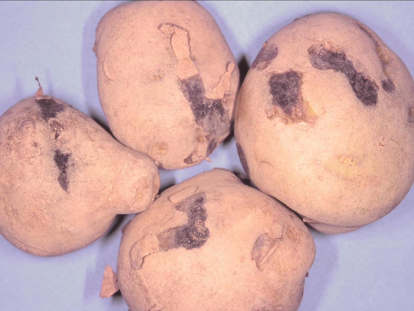 Description: Des tubercules de pomme de terre (cv 'Kennebec') provenant d’un entrepôt montrent la présence de zones dépressives fermes et plutôt ovales sur le périderme. Les zones paraissent brunes et les dépressions sont peu profondes. Certaines lésions sont colonisées par un mycélium noirâtre. Ces zones dépressives sont liées à des meurtrissures ou blessures de pression qui se produisent en entrepôt lorsque la pression exercée par les tubercules les uns sur les autres est très élevée dans un tas de tubercu… En savoir plus