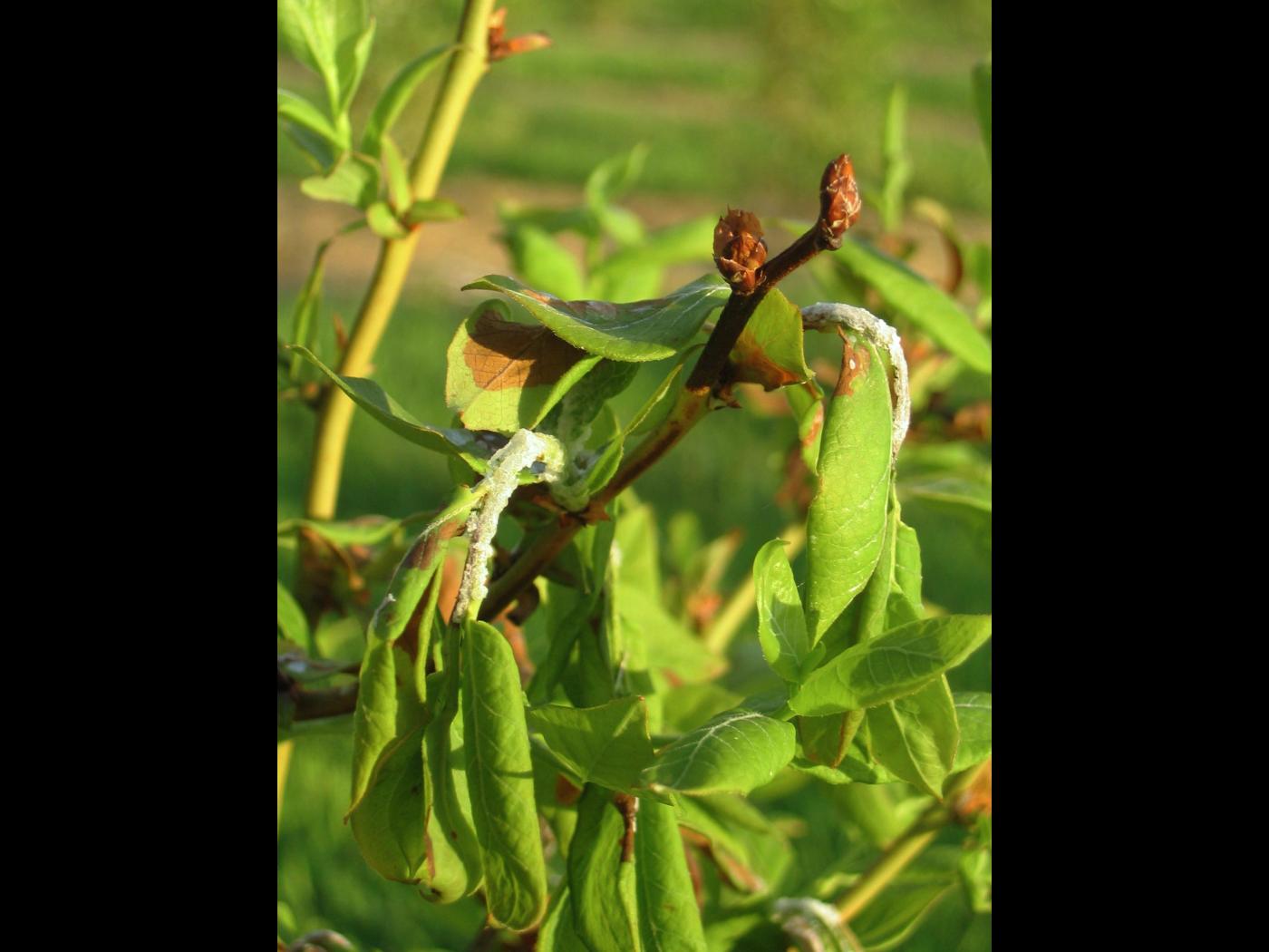Feuille : brûlure partielle ou complète de la marge, à l’apex ou sur le limbe. Souvent présence d’une pellicule blanchâtre (dépôt) sur le limbe.