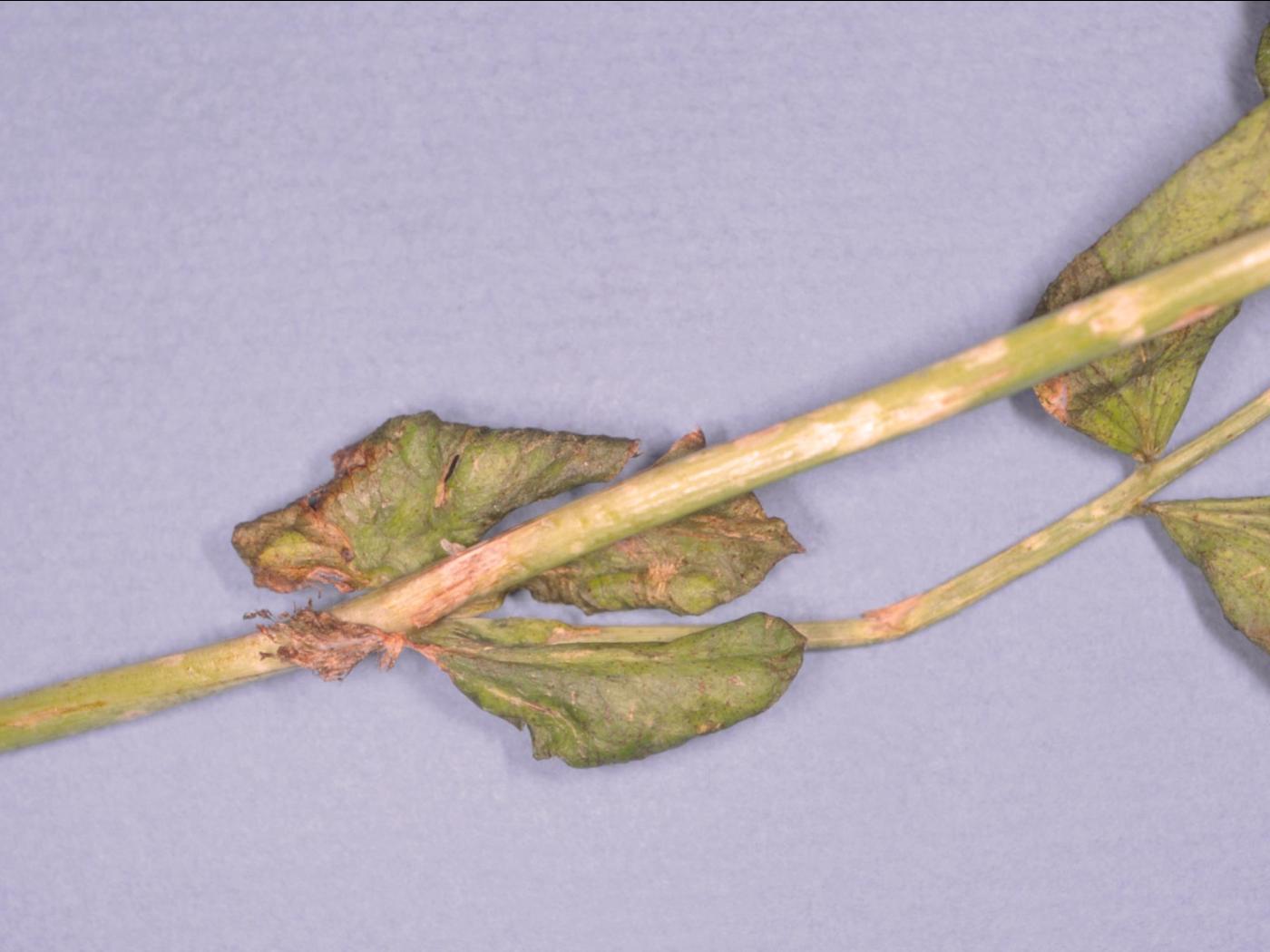 Tige : se brisent, cassent ou sont écrasées. Des zones meurtries allongées et blanchâtres devenant brunes peuvent être observées.