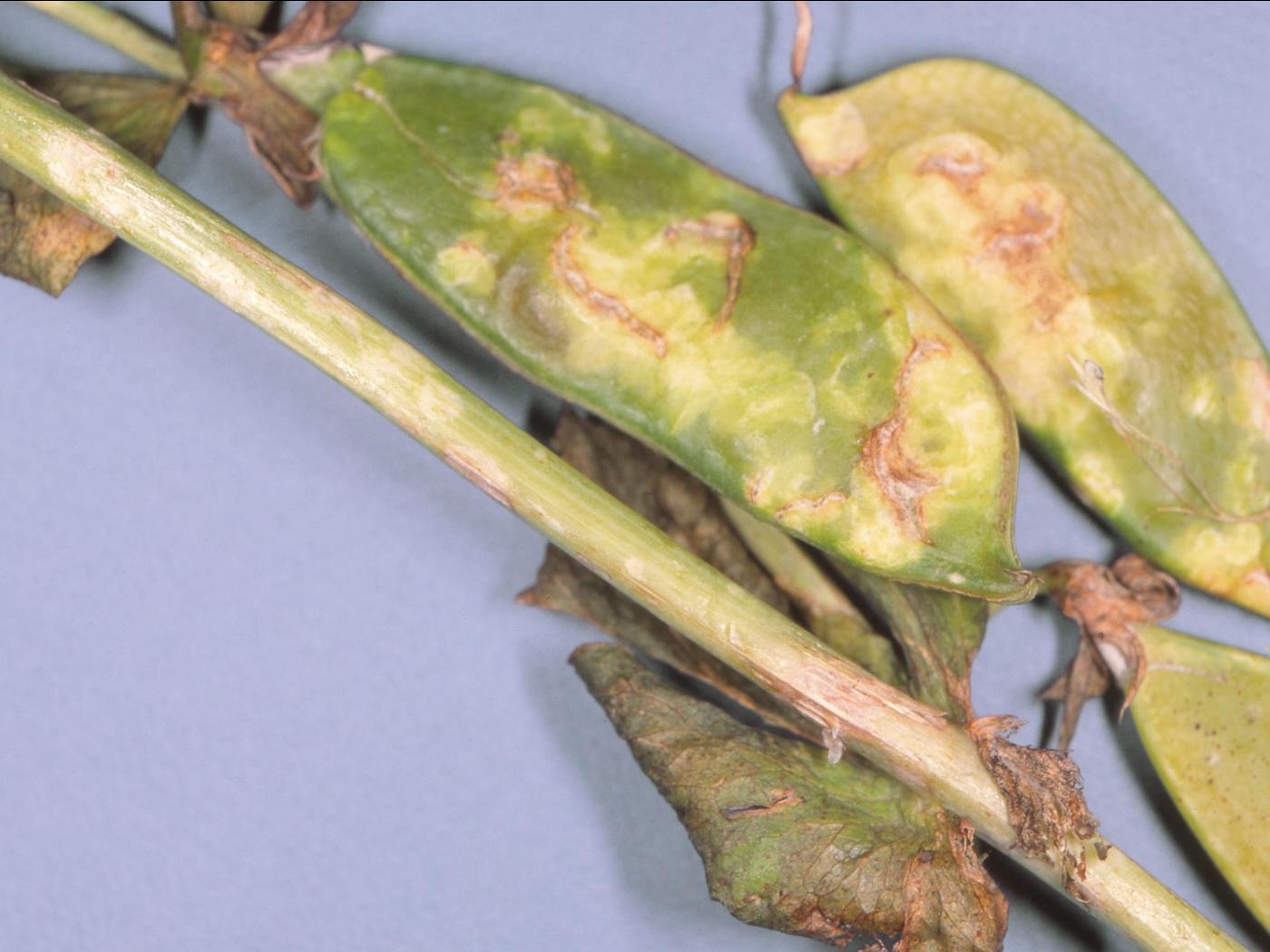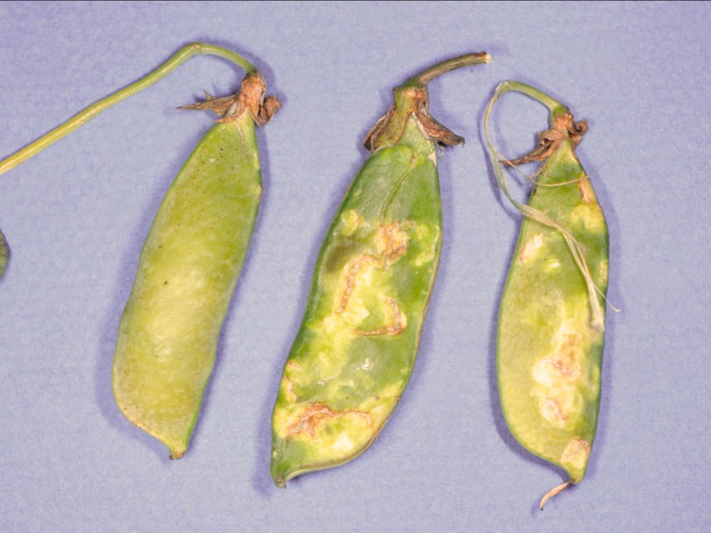 Légende: Comparaison entre une gousse de pois saine et des gousses affectées