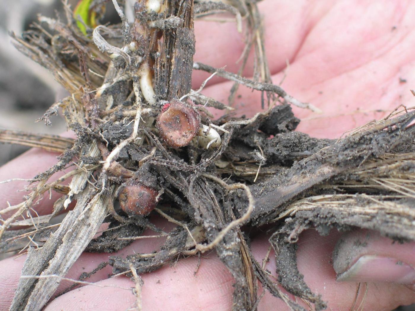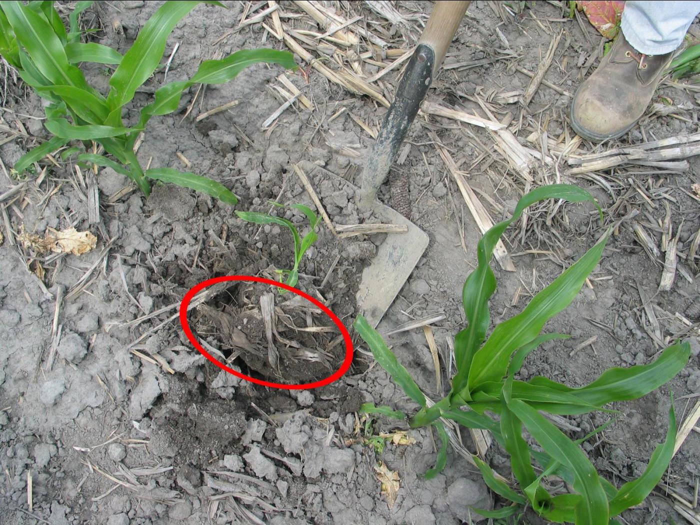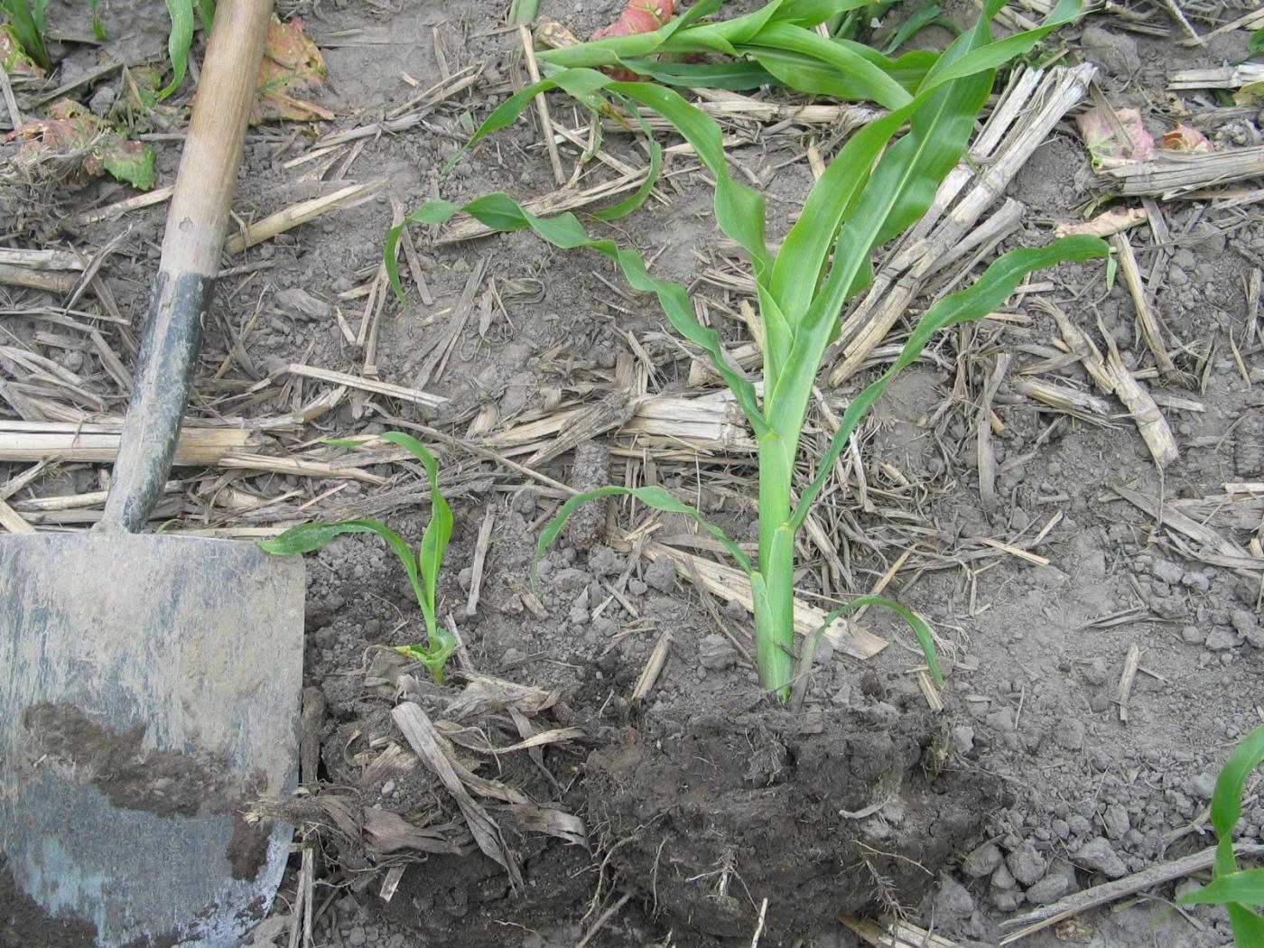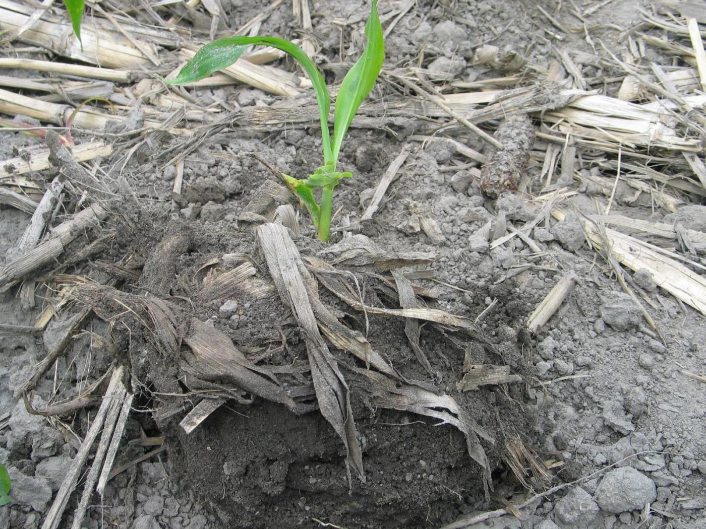 Description: Le développement du système racinaire de ce plant de maïs grain et fourrager est perturbé par la présence de résidus de culture. Le semis a été effectué dans des résidus de maïs à la suite du chisel. La levée inégale des plants est liée à un lit de semence inadéquat.