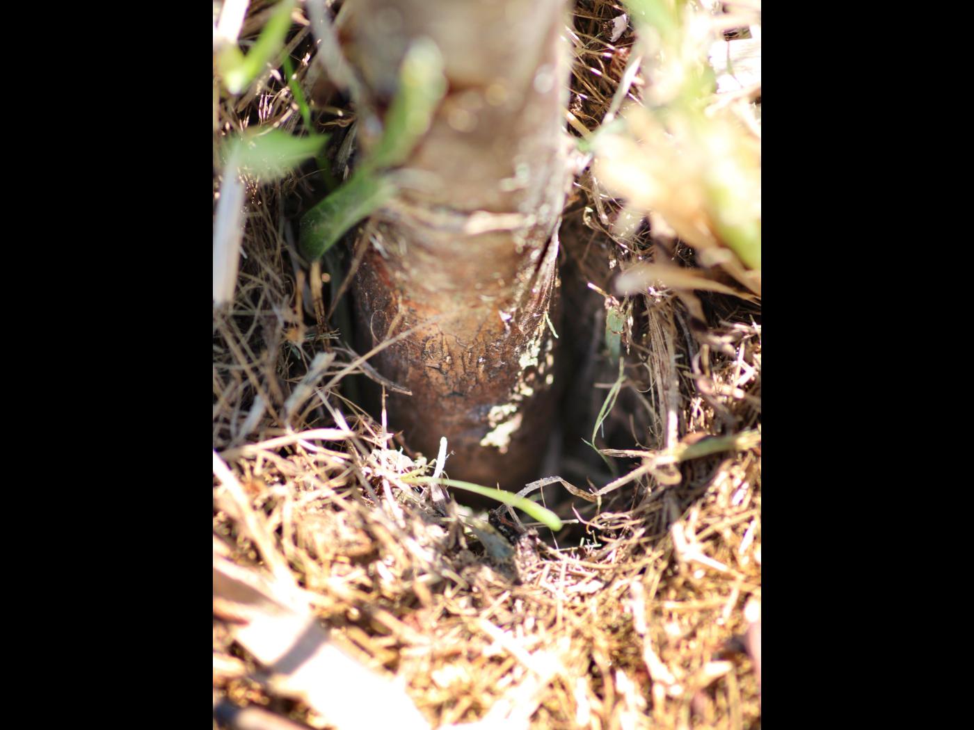 Tronc: L’arbuste dans son ensemble bouge à la base sous l’effet du vent ou lorsqu’on lui applique une légère pression. Le mouvement de l’arbre donne l’impression qu’il serait facile de l’arracher à la main. Le sol se tape en un cône inversé et évasé autour du tronc à cause de la mobilité de l’arbuste.