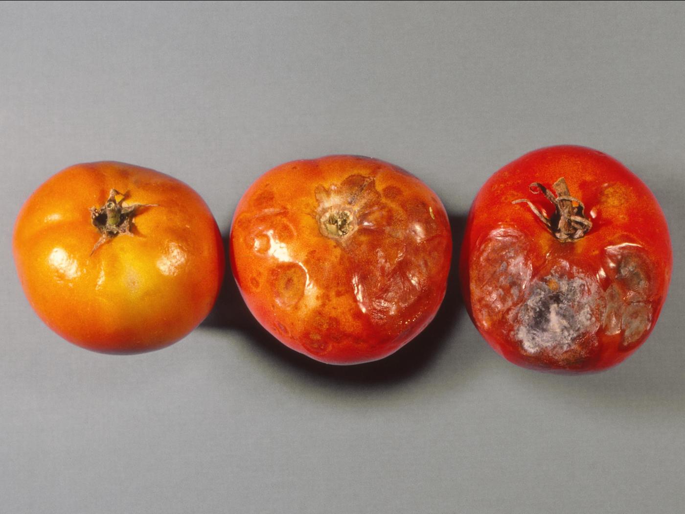 Description: Des tomates de champ montrent des symptômes d’une intensité différente. Un fruit montre des taches brunes légèrement dépressives, l’autre présente des taches brunes dépressives et un début de pourriture et sur le troisième fruit, les taches brunes dépressives sont pourries et couvertes d’un mycélium. Les taches sont localisées principalement sur le dessus du fruit et essentiellement sur un seul côté. Ces symptômes sont causés par de l’eau froide qui a séjourné trop longtemps sur le fruit.
