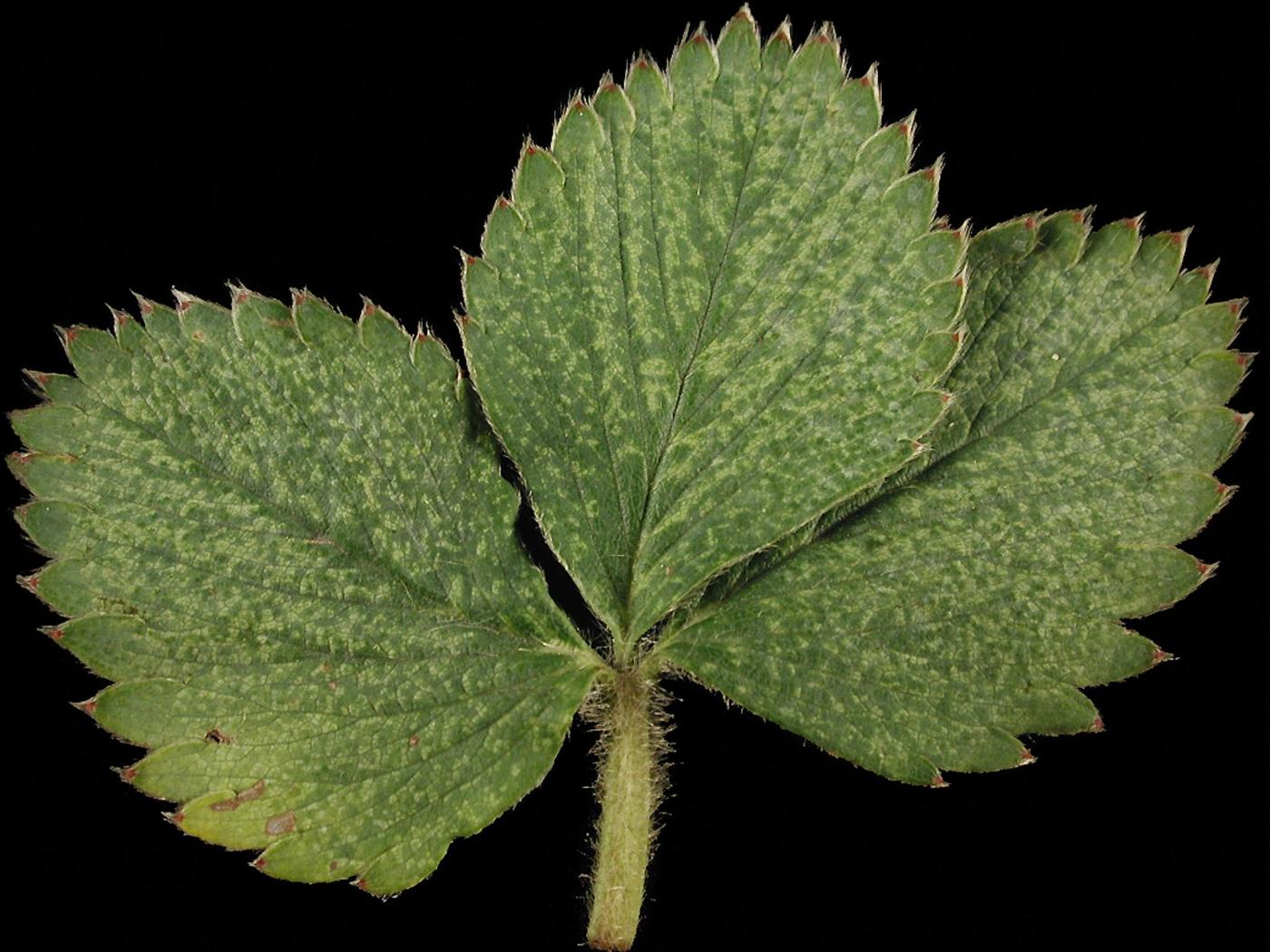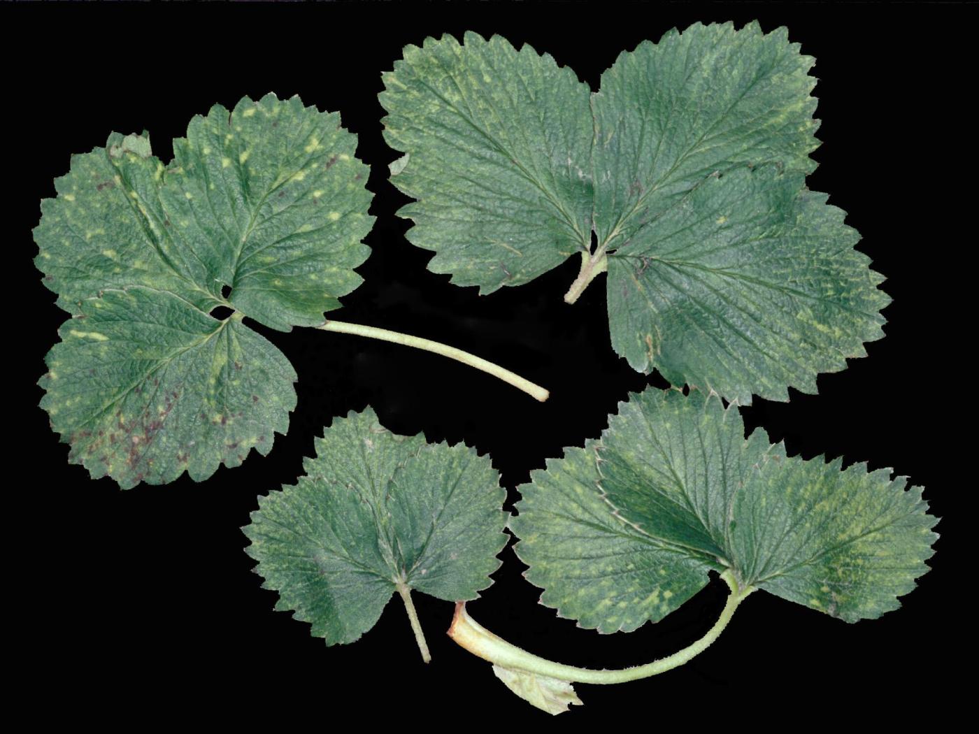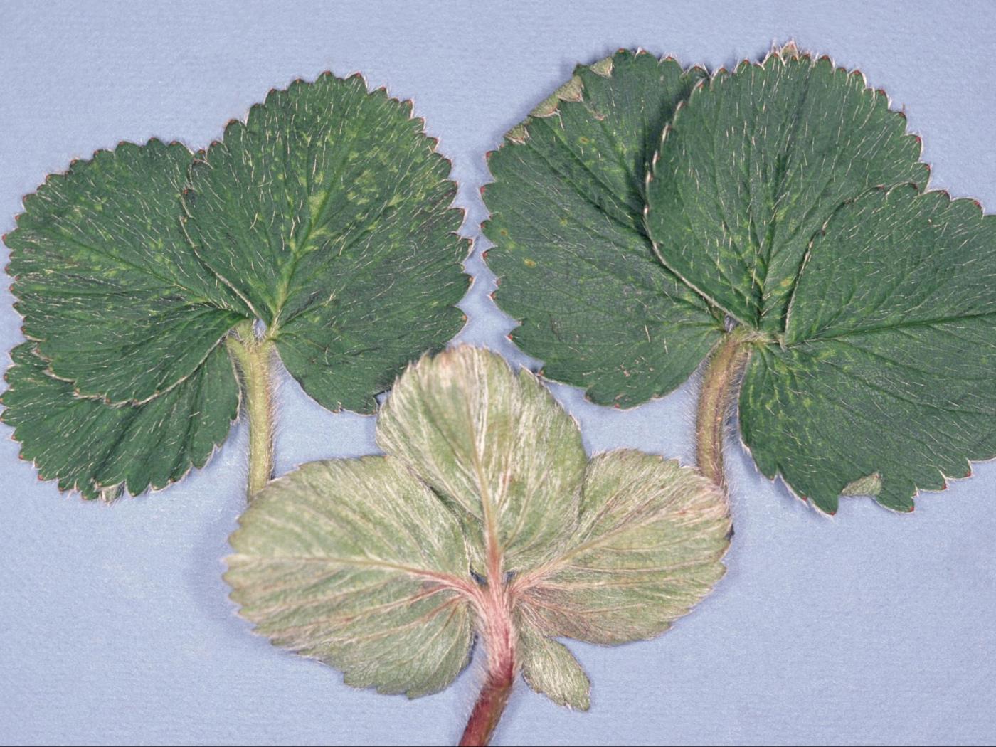 Description: Les feuilles de fraisier sont affectées par de nombreuses et minuscules taches blanchâtres à jaunâtres. Elles sont généralement plus nombreuses sur la moitié supérieure des folioles comparativement à leur partie basale. Elles ne sont apparentes qu'à la face supérieure. Les symptômes sont similaires sur la feuille de gauche sauf qu’ils prennent la forme d’un jaunissement entre les nervures. Ces taches surviennent habituellement à la suite du retrait de la paille. Ces taches peuvent être causées p… En savoir plus