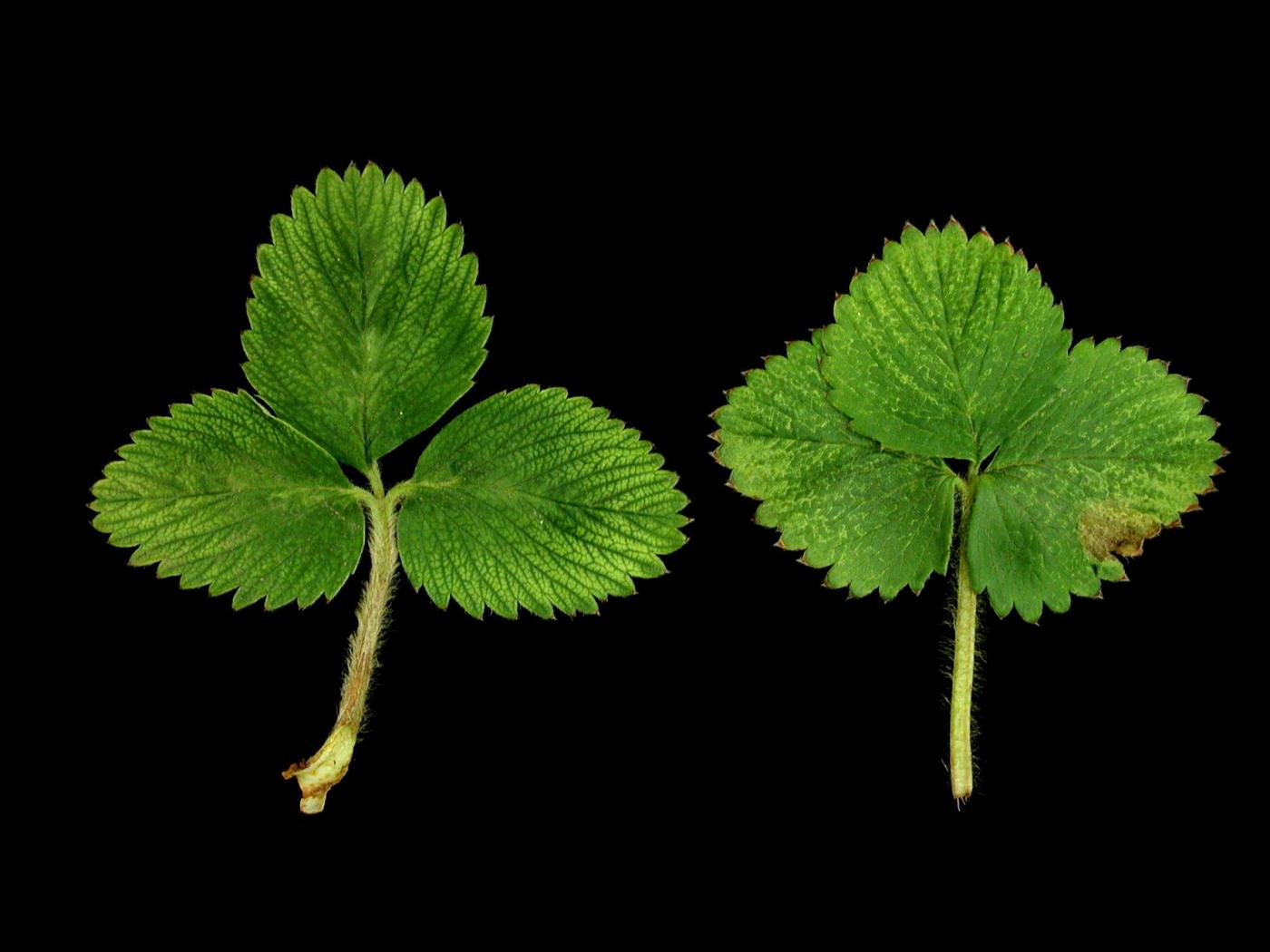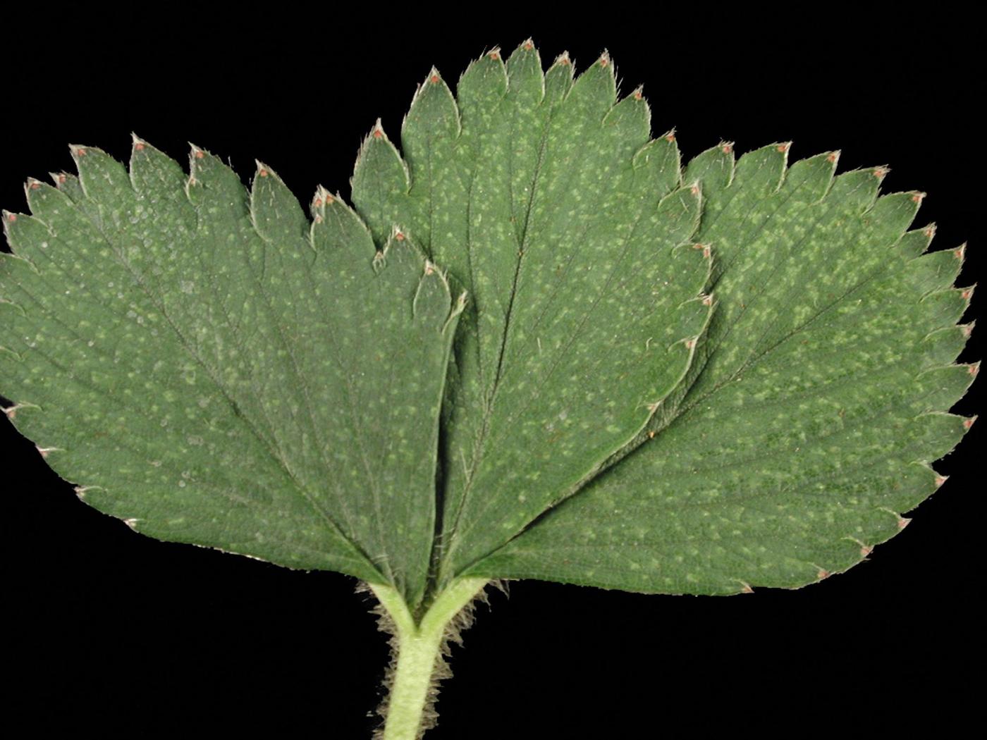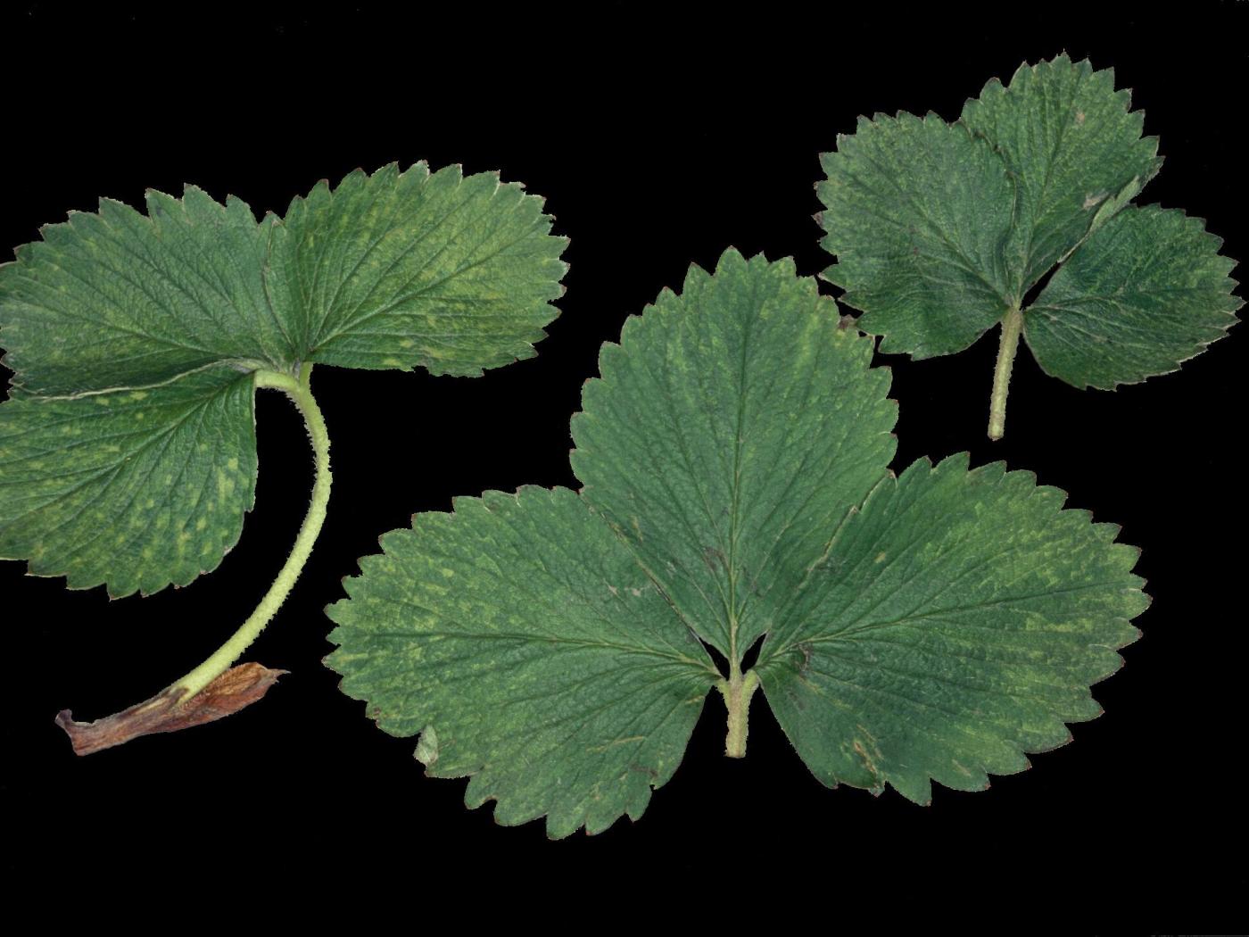 Description: Les feuilles de fraisier sont affectées par de nombreuses et minuscules taches blanchâtres à jaunâtres. Elles sont généralement plus nombreuses sur la moitié supérieure des folioles comparativement à leur partie basale. Elles ne sont apparentes qu'à la face supérieure. Les symptômes sont similaires sur la feuille de gauche sauf qu’ils prennent la forme d’un jaunissement entre les nervures. Ces taches surviennent habituellement à la suite du retrait de la paille. Ces taches peuvent être causées p… En savoir plus