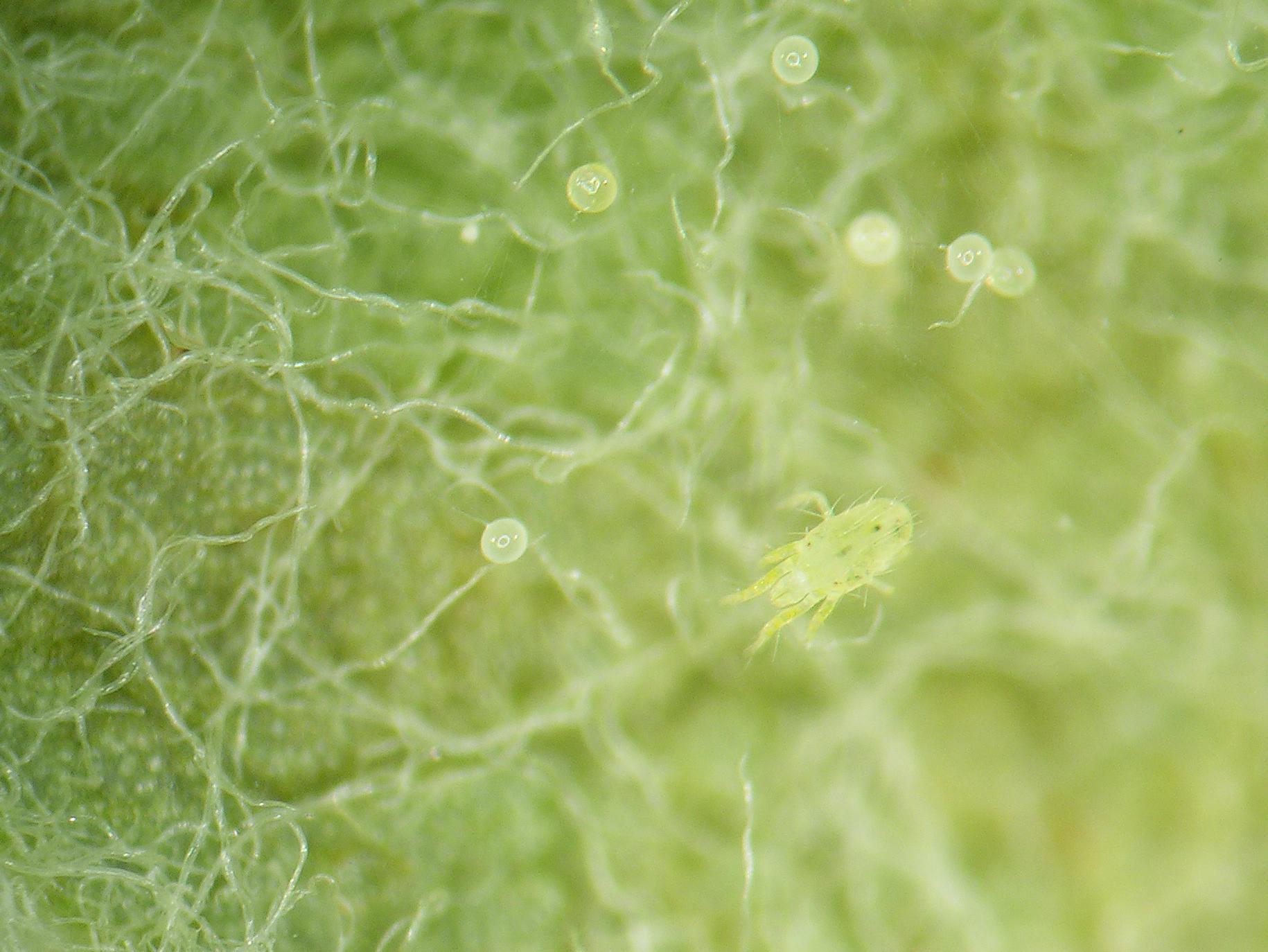 Légende: Une nymphe de tétranyque de McDaniel et plusieurs oeufs sur du feuillage