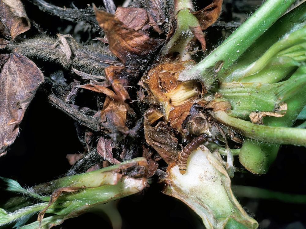 Description: Collet de fraisier présentant des dommages causés par le perce-tige de la pomme de terre. La larve (visible sur la photo) se nourrit du collet de la plante en y creusant une galerie. Par la suite, n'étant plus alimenté par les racines, le feuillage jaunit, brunit et tombe. Les dégâts peuvent entraîner le dépérissement de la plante entière.