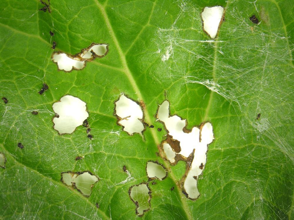 Feuille de bleuet perforée par une larve de tordeuse à bandes obliques : la larve perce des trous au centre de la feuille après s'être partiellement enroulée dans celle-ci à l'aide de la soie qu'elle tisse. Des fèces (petites boules brunes sur la photo) sont fréquemment observées dans la feuille partiellement enroulée.