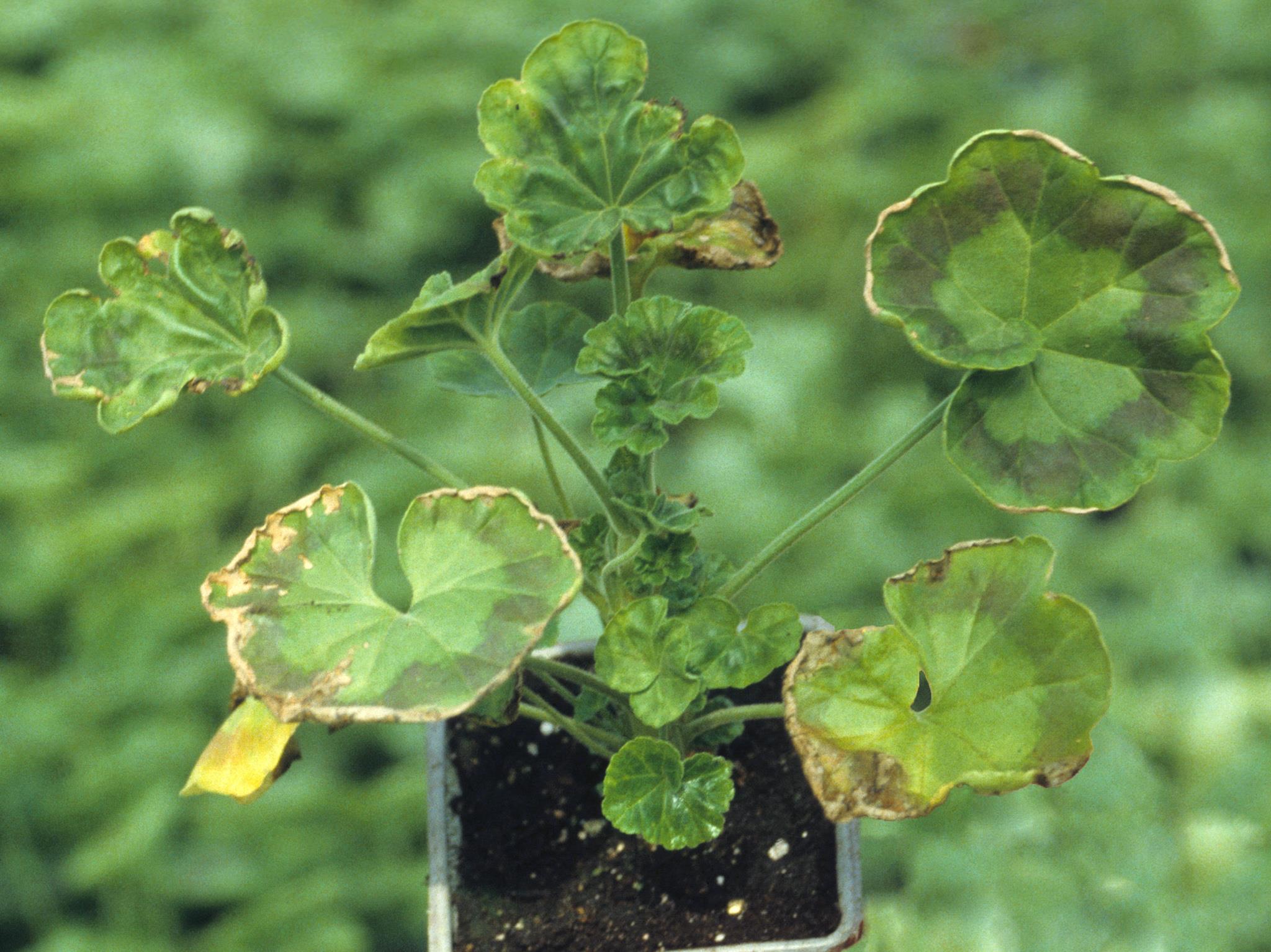 Description: Sur un géranium zonal cultivé en serre, la marge des feuilles basales est jaunie et brûlée. Le limbe de quelques feuilles est déformé. Les nouvelles feuilles sont sans symptôme. L’analyse du substrat a révélé une concentration élevée en sels. Les symptômes sont donc causés par une salinité élevée.