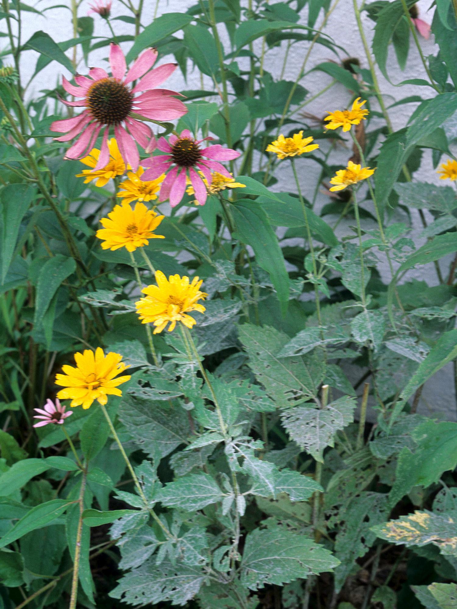 Description: À la face supérieure des feuilles d’héliopside cultivé au champ, présence de taches poudreuses blanchâtres recouvrant la totalité du limbe. L’examen à la loupe a permis de confirmer la présence du champignon Erysiphe sp., responsable du blanc (oïdium). Il s’agit probablement d’Erysiphe cichoracearum rapporté chez l’héliopside. Notez que les échinacées, à l'arrière-plan, sont également très sensibles au blanc.