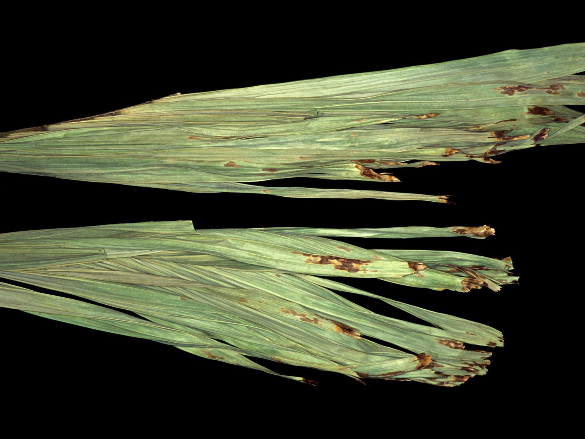 Description: Les feuilles terminales d’un palmier de Noël présentent des taches ou des brûlures irrégulières brunes avec un halo jaune. Les taches sont situées principalement dans la partie supérieure des feuilles. Les tests de laboratoire ont révélé la présence du champignon Drechslera sp. Il s’agit probablement de Drechslera setariae (syn. Bipolaris setariae), responsable de la tache helminthosporienne chez les palmiers.