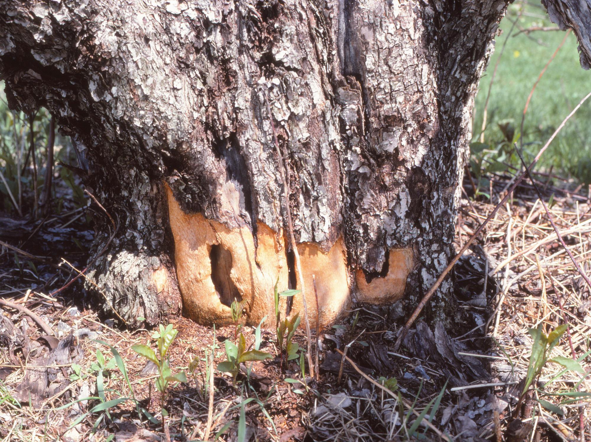 Description: La partie basale d’un tronc de pommier montre une grosse blessure où l’écorce et une partie du bois ont été rongées. Ces blessures sont causées par le rongement fait par des campagnols (mulots).
