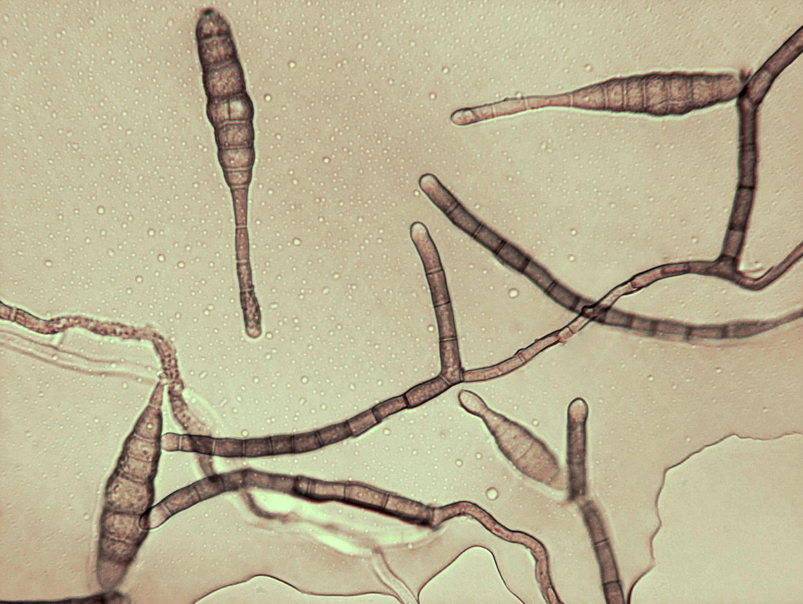 Légende: Conidies, conidiophores et hyphe d'Alternaria tagetica